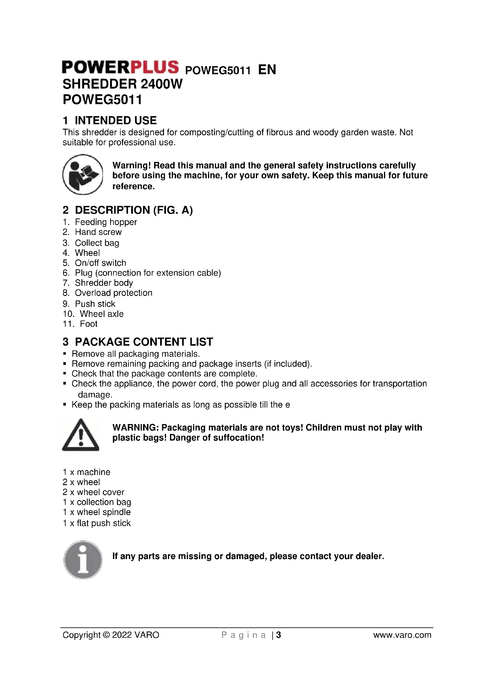 - Keep children and pets away. All onlookers should be kept a safe distance away from the shredder when it is in use.POWEG5011 EN Copyright © 2022 VARO P a g i n a | 7 www.varo.com