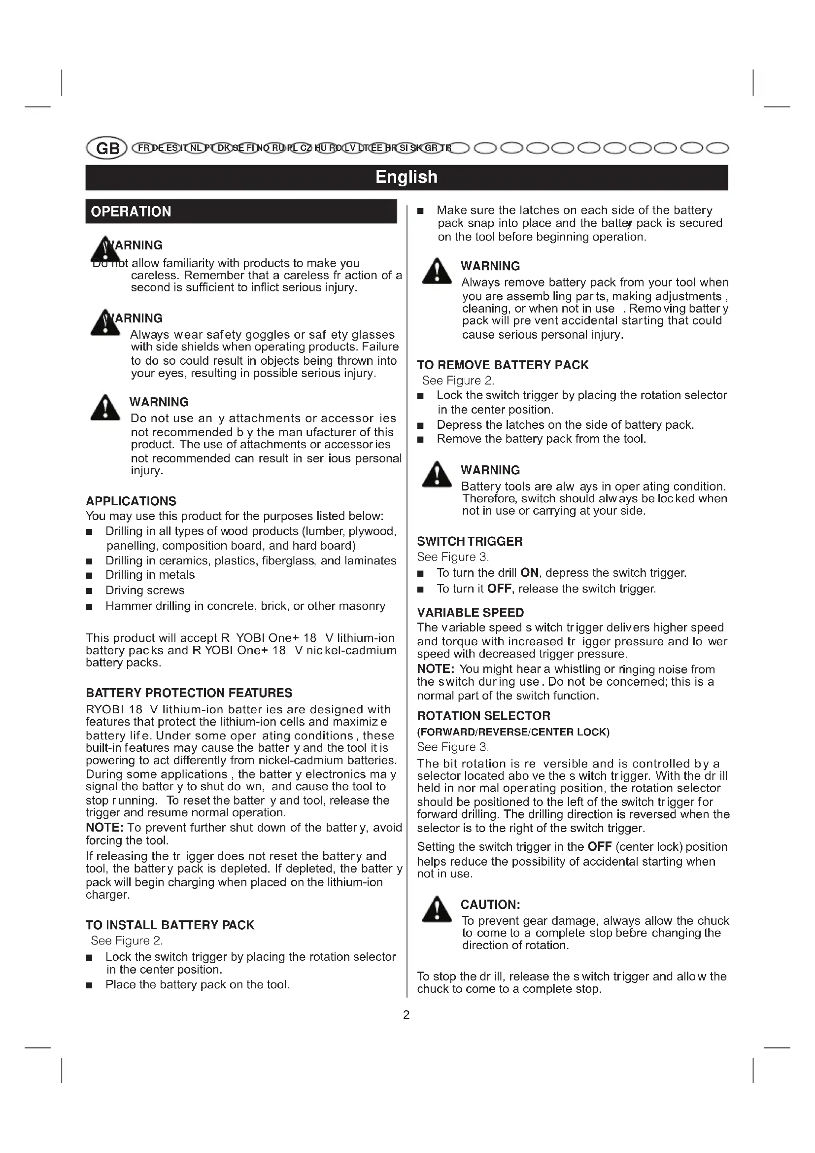 FR DE ES IT NL PT DK SE FI NO RU PL CZ HU RO LV LT EE HR SI SK GR TR OPERATION WARNING Do not allow familiarity with products to make you careless. Remember that a careless fr action of a second is sufficient to inflict serious injury. WARNING Always wear safety goggles or saf ety glasses with side shields when operating products. Failure to do so could result in objects being thro your eyes, resulting in possible serious injury. wn into WARNING Do not use an y attachments or accessor ies not recommended b y the man ufacturer of this product. The use of attachments or accessor not recommended can result in ser ious personal injury. APPLICATIONS You may use this product for the purposes listed below: ■ Drilling in all types of wood products (lumber, plywood, panelling, composition board, and hard board) ■ Drilling in ceramics, plastics, fiberglass, and laminates ■ Drilling in metals■ Driving screws ■ Hammer drilling in concrete, brick, or other masonry This product will accept R YOBI One+ 18 V lithium-ion battery pac ks and R YOBI One+ 18 V nic kel-cadmium battery packs.