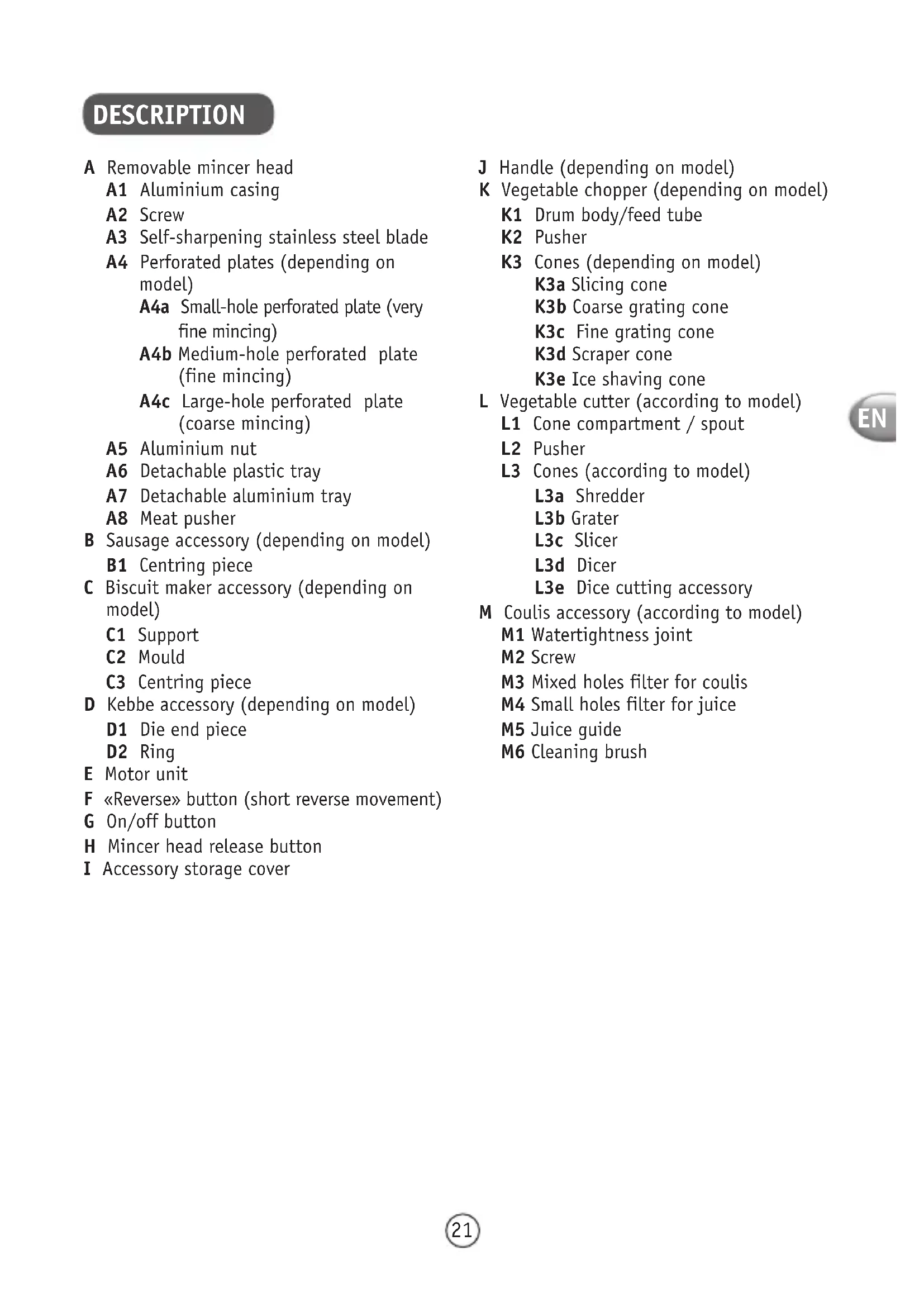DESCRIPTION A Removable mincer head A1 Aluminium casing A2 Screw A3 Self-sharpening stainless steel blade A4 Perforated plates (depending on model) A4a Small-hole perforated plate (very fine mincing) A4b Medium-hole perforated plate (fine mincing) A4c Large-hole perforated plate (coarse mincing) A5 Aluminium nut A6 Detachable plastic tray A7 Detachable aluminium tray A8 Meat pusher B Sausage accessory (depending on model) B1 Centring piece C Biscuit maker accessory (depending on model) C1 Support C2 Mould C3 Centring piece D Kebbe accessory (depending on model) D1 Die end piece D2 Ring E Motor unit F «Reverse» button (short reverse movement) G On/off button H Mincer head release button I Accessory storage cover J Handle (depending on model) K Vegetable chopper (depending on model) K1 Drum body/feed tube K2 Pusher K3 Cones (depending on model) K3a Slicing cone K3b Coarse grating cone K3c Fine grating cone K3d Scraper cone K3e Ice shaving cone L Vegetable cutter (according to model) L1 Cone compartment / spout L2 Pusher L3 Cones (according to model) L3a Shredder L3b Grater L3c Slicer L3d Dicer L3e Dice cutting accessory M Coulis accessory (according to model) M1 Watertightness joint M2 Screw M3 Mixed holes filter for coulis M4 Small holes filter for juice M5 Juice guide M6 Cleaning brush22