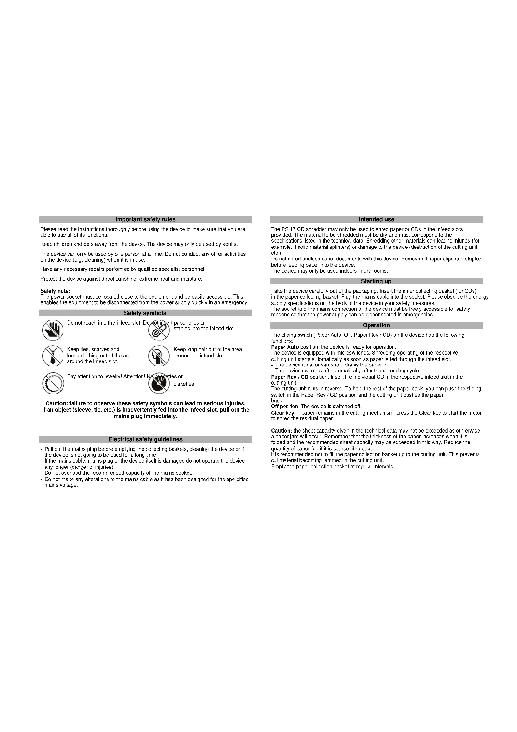 PLEASE STORE IN A SAFE PLACE. Dear Customer, Thank you for buying a quality product from . In the unlikely event that the device should develop a technical problem please observe the following points: ¾ The guarantee period for the device is 24 months. ¾ Make sure that you store the purchasing receipt and the original packaging. ¾ Should a problem occur, please call our hotline first: + 49 (0) 180/500 7514 (Fee for connections outside Germany: additional Euro 0.14 per call for the connection within Germany.) Our personnel are often able to provide helpful advice over the phone. ¾ If it is not possible to clear up the problem over the phone, please send the device back to the following address: Service-Center Hattingen Weg zum Wasserwerk 10 45525 Hattingen, Germany Guarantee repairs will only be performed if the purchase receipt is enclosed with the device. Thank you for your understanding. Yours faithfully, Your Olympia Business Systems partner PS 17 CD Destructeur de documents automatique