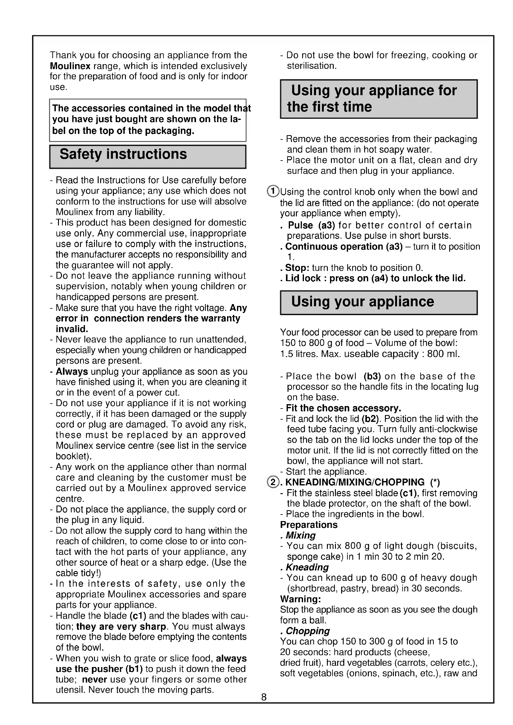 - Place the bowl (b3) on the base of the processor so the handle fits in the locating lug on the base. - Fit the chosen accessory. - Fit and lock the lid (b2). Position the lid with the feed tube facing you. Turn fully anti-clockwise so the tab on the lid locks under the top of the motor unit. If the lid is not correctly fitted on the bowl, the appliance will not start. - Start the appliance. . KNEADING/MIXING/CHOPPING (*) - Fit the stainless steel blade (c1), first removing the blade protector, on the shaft of the bowl. - Place the ingredients in the bowl. Preparations . Mixing - You can mix 800 g of light dough (biscuits, sponge cake) in 1 min 30 to 2 min 20. . Kneading - You can knead up to 600 g of heavy dough (shortbread, pastry, bread) in 30 seconds.