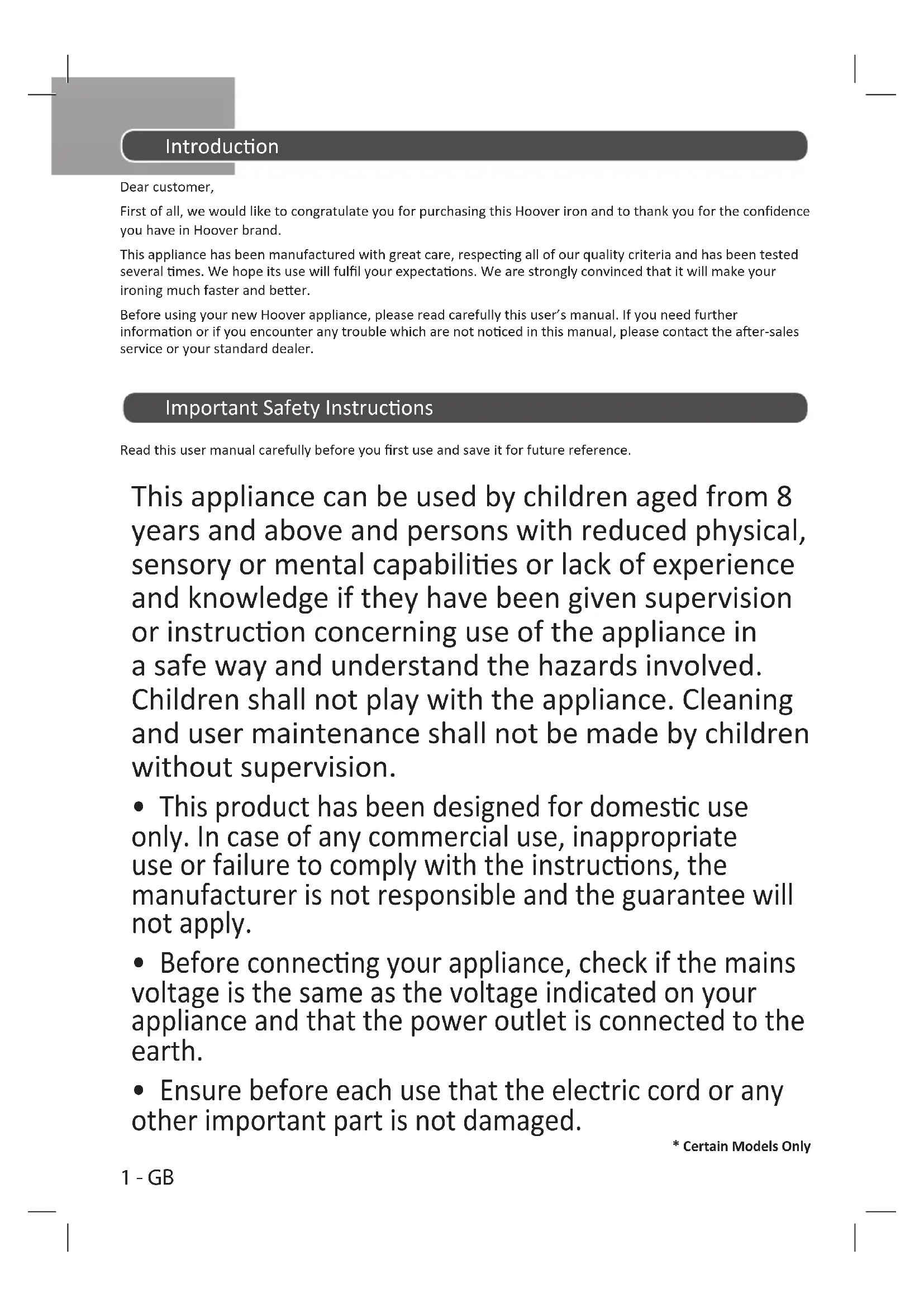 - Certain Models Only Introducon Dear customer, First of all, we would like to congratulate you for purchasing this Hoover iron and to thank you for the condence you have in Hoover brand. This appliance has been manufactured with great care, respecng all of our quality criteria and has been tested several mes. We hope its use will full your expectaons. We are strongly convinced that it will make your ironing much faster and beer. Before using your new Hoover appliance, please read carefully this user’s manual. If you need further informaon or if you encounter any trouble which are not noced in this manual, please contact the aer-sales service or your standard dealer. Important Safety Instrucons Read this user manual carefully before you rst use and save it for future reference. This appliance can be used by children aged from 8 years and above and persons with reduced physical, sensory or mental capabilies or lack of experience and knowledge if they have been given supervision or instrucon concerning use of the appliance in a safe way and understand the hazards involved. Children shall not play with the appliance. Cleaning and user maintenance shall not be made by children without supervision.