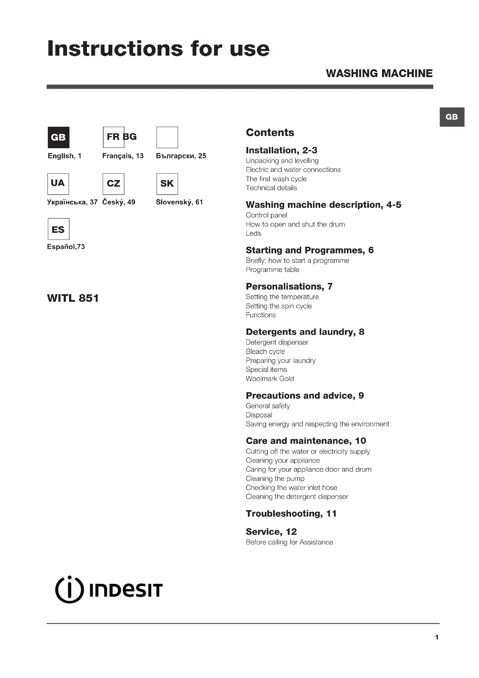 WASHING MACHINE WITL 851 Instructions for use Contents Installation, 2-3 Unpacking and levelling Electric and water connections The first wash cycle Technical details Washing machine description, 4-5 Control panel How to open and shut the drum Leds Starting and Programmes, 6 Briefly: how to start a programme Programme table Personalisations, 7 Setting the temperature Setting the spin cycle Functions Detergents and laundry, 8 Detergent dispenser Bleach cycle Preparing your laundry Special items Woolmark Gold Precautions and advice, 9 General safety Disposal Saving energy and respecting the environment Care and maintenance, 10 Cutting off the water or electricity supply Cleaning your appliance Caring for your appliance door and drum Cleaning the pump Checking the water inlet hose Cleaning the detergent dispenser Troubleshooting, 11 Service, 12 Before calling for Assistance English, 1