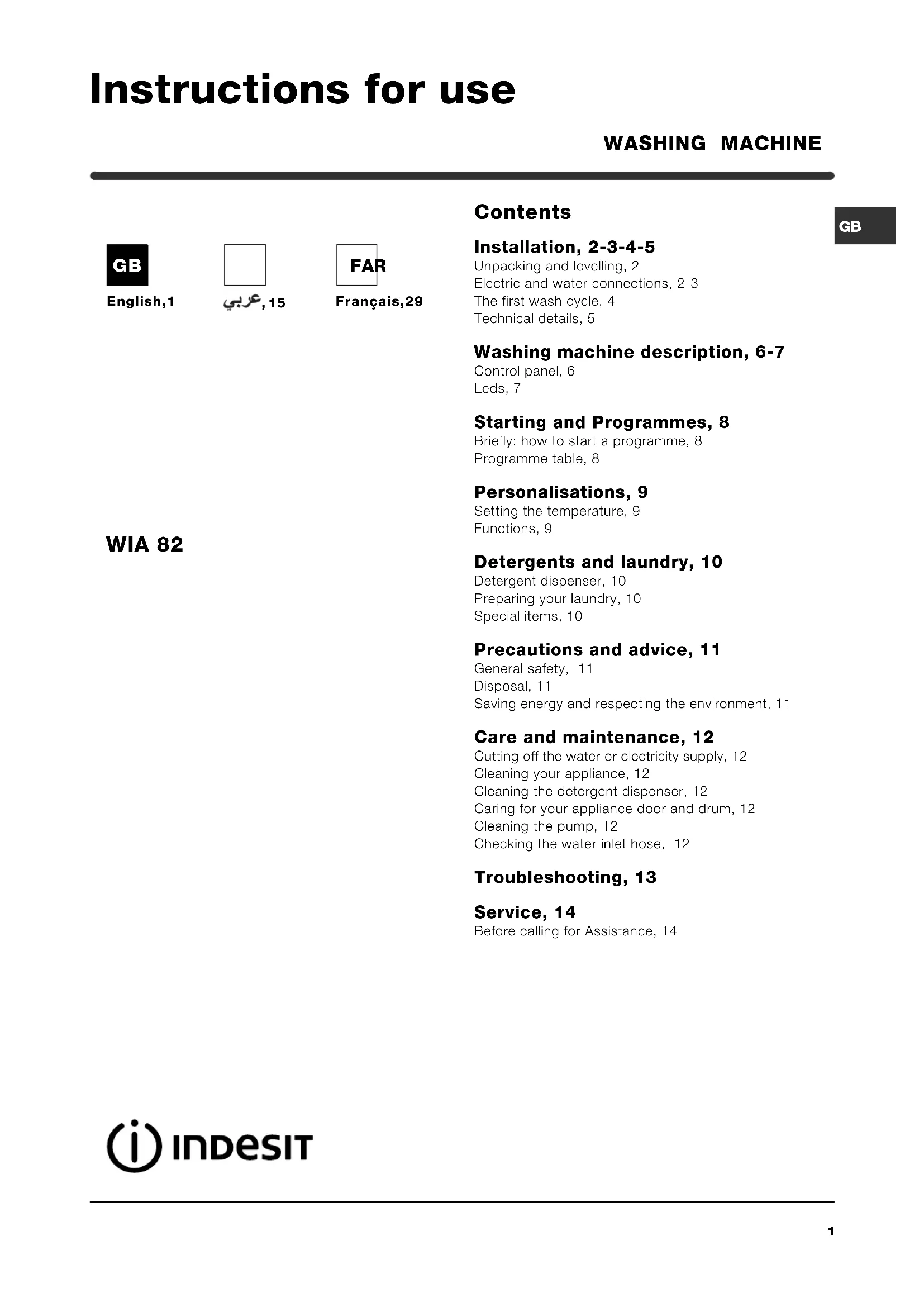 English,1 Contents Installation, 2-3-4-5 Unpacking and levelling, 2 Electric and water connections, 2-3 The first wash cycle, 4 Technical details, 5 Washing machine description, 6-7 Control panel, 6 Leds, 7 Starting and Programmes, 8 Briefly: how to start a programme, 8 Programme table, 8 Personalisations, 9 Setting the temperature, 9 Functions, 9 Detergents and laundry, 10 Detergent dispenser, 10 Preparing your laundry, 10 Special items, 10 Precautions and advice, 11 General safety, 11 Disposal, 11 Saving energy and respecting the environment, 11 Care and maintenance, 12 Cutting off the water or electricity supply, 12 Cleaning your appliance, 12 Cleaning the detergent dispenser, 12 Caring for your appliance door and drum, 12 Cleaning the pump, 12 Checking the water inlet hose, 12 Troubleshooting, 13 Service, 14 Before calling for Assistance, 14 WASHING MACHINE WIA 82 Instructions for use
