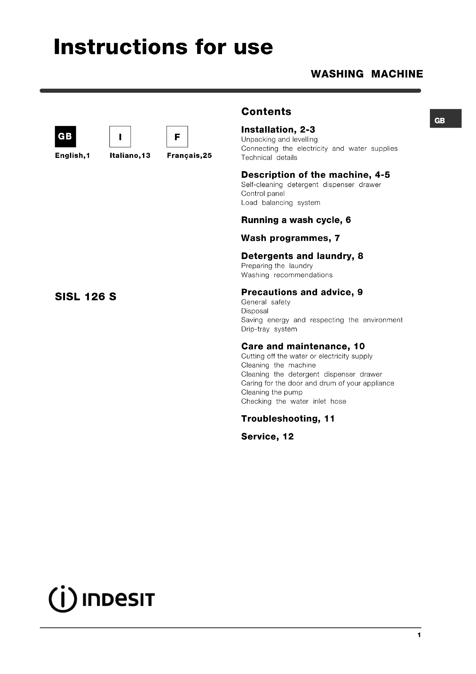 English,1 Contents Installation, 2-3 Unpacking and levelling Connecting the electricity and water supplies Technical details Description of the machine, 4-5 Self-cleaning detergent dispenser drawer Control panel Load balancing system Running a wash cycle, 6 Wash programmes, 7 Detergents and laundry, 8 Preparing the laundry Washing recommendations Precautions and advice, 9 General safety Disposal Saving energy and respecting the environment Drip-tray system Care and maintenance, 10 Cutting off the water or electricity supply Cleaning the machine Cleaning the detergent dispenser drawer Caring for the door and drum of your appliance Cleaning the pump Checking the water inlet hose Troubleshooting, 11 Service, 12 WASHING MACHINE SISL 126 S Instructions for use