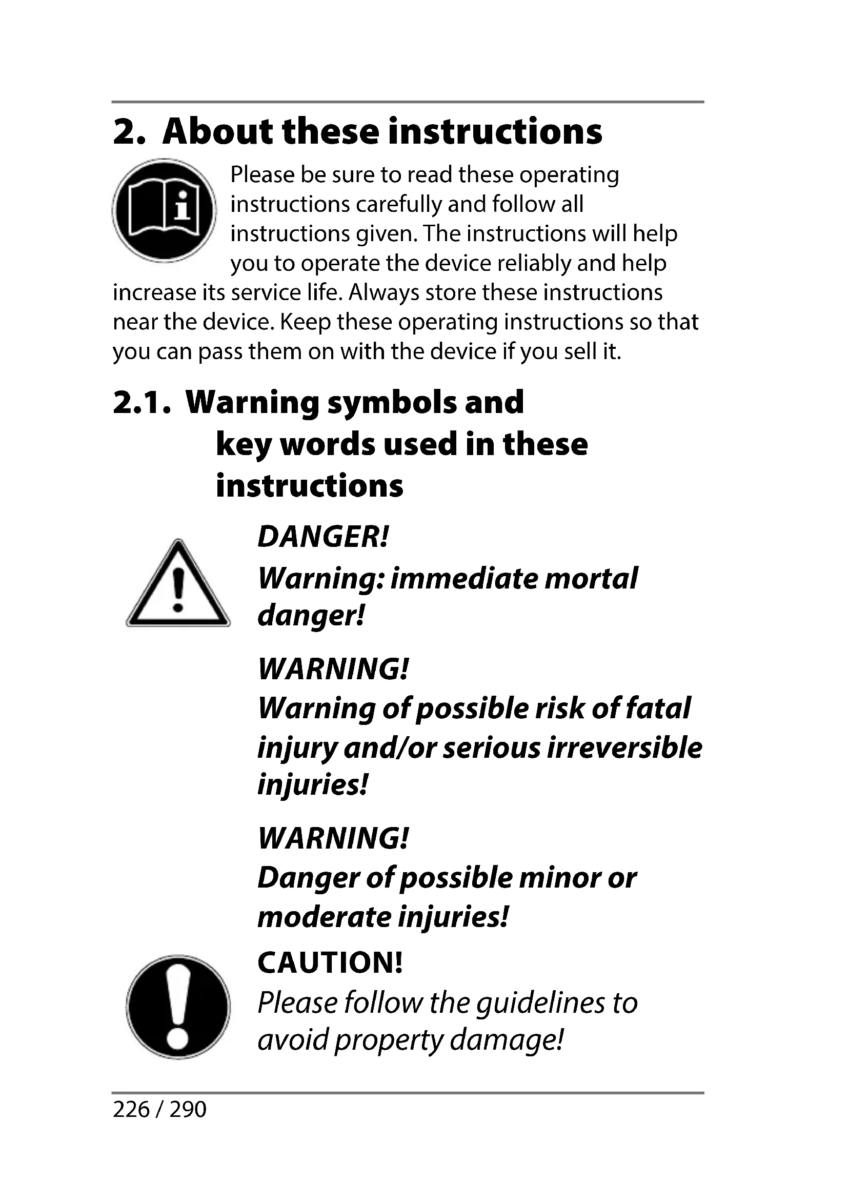 Please be sure to read these operating instructions carefully and follow all instructions given. The instructions will help you to operate the device reliably and help increase its service life. Always store these instructions near the device. Keep these operating instructions so that you can pass them on with the device if you sell it. 2.1. Warning symbols and key words used in these instructions DANGER!