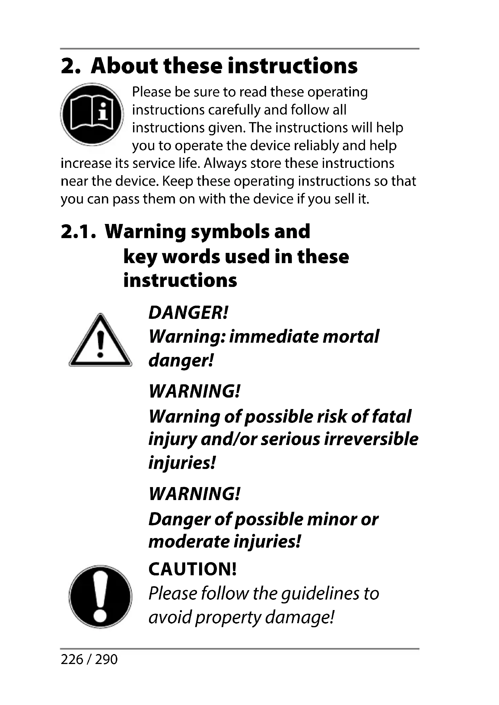 Please be sure to read these operating instructions carefully and follow all instructions given. The instructions will help you to operate the device reliably and help increase its service life. Always store these instructions near the device. Keep these operating instructions so that you can pass them on with the device if you sell it. 2.1. Warning symbols and key words used in these instructions DANGER!