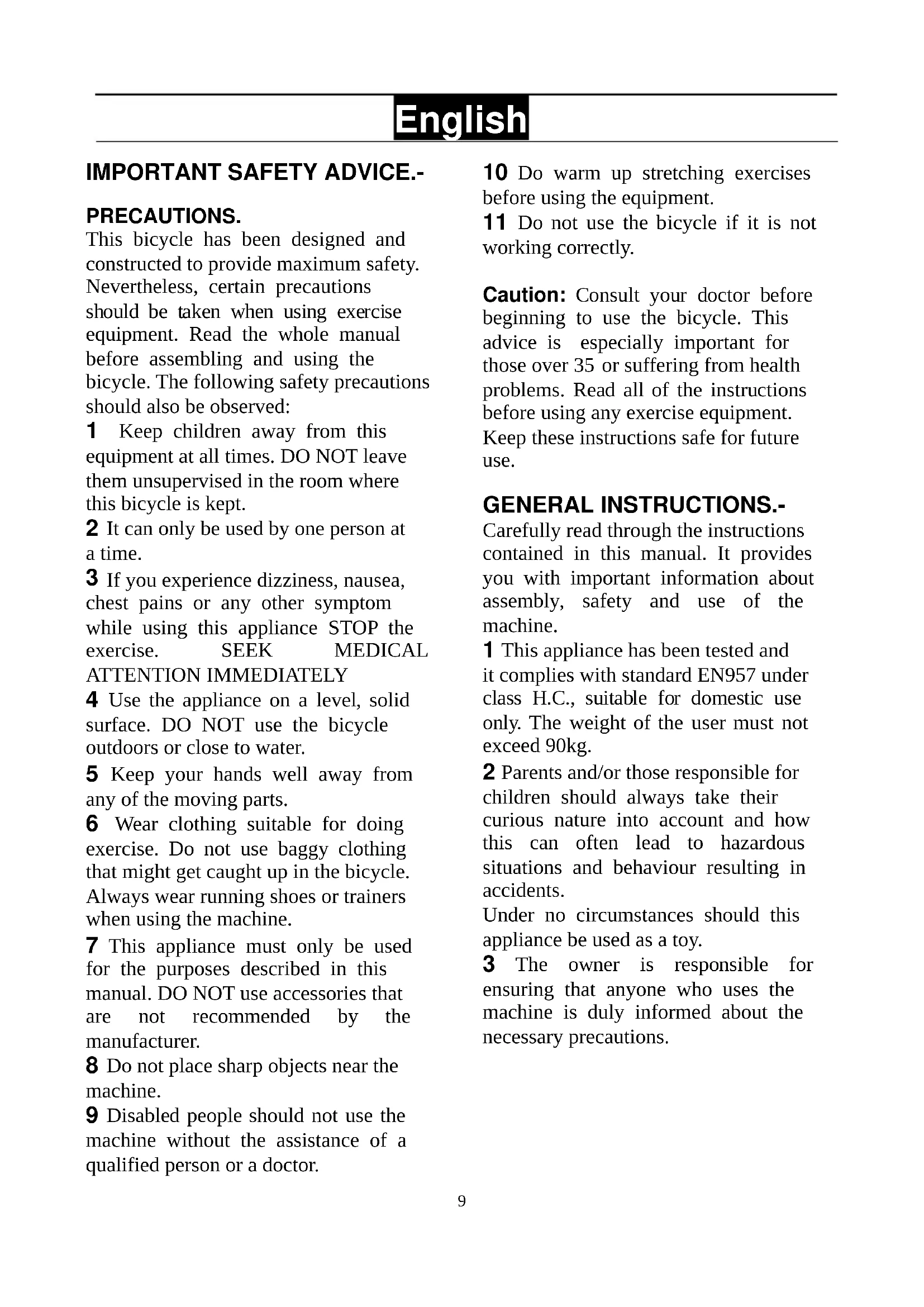 Do not use the bicycle if it is not working correctly. Caution: Consult your doctor before beginning to use the bicycle. This advice is especially important for those over 35 or suffering from health problems. Read all of the instructions before using any exercise equipment. Keep these instructions safe for future use. GENERAL INSTRUCTIONS.- Carefully read through the instructions contained in this manual. It provides you with important information about assembly, safety and use of the machine.