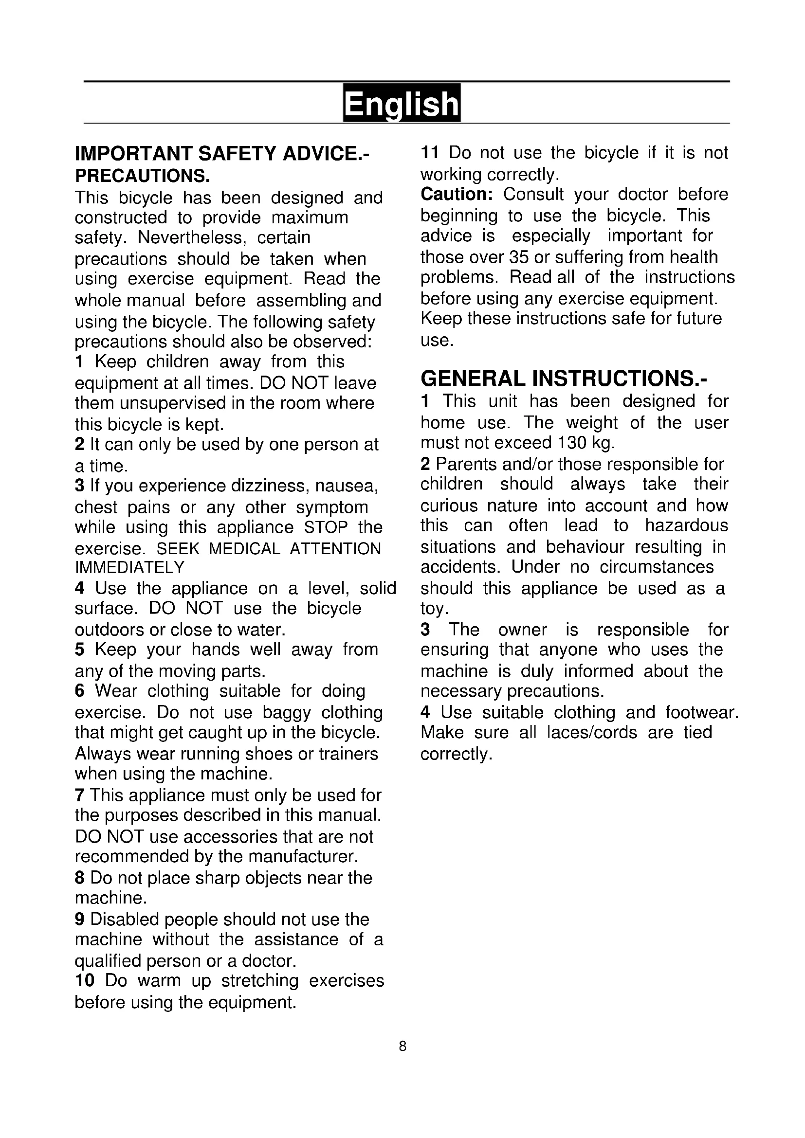PRECAUTIONS. This bicycle has been designed and constructed to provide maximum safety. Nevertheless, certain precautions should be taken when using exercise equipment. Read the whole manual before assembling and using the bicycle. The following safety precautions should also be observed: 1 Keep children away from this equipment at all times. DO NOT leave them unsupervised in the room where this bicycle is kept. 2 It can only be used by one person at a time. 3 If you experience dizziness, nausea, chest pains or any other symptom while using this appliance STOP the exercise. SEEK MEDICAL ATTENTION IMMEDIATELY 4 Use the appliance on a level, solid surface. DO NOT use the bicycle outdoors or close to water. 5 Keep your hands well away from any of the moving parts. 6 Wear clothing suitable for doing exercise. Do not use baggy clothing that might get caught up in the bicycle. Always wear running shoes or trainers when using the machine. 7 This appliance must only be used for the purposes described in this manual. DO NOT use accessories that are not recommended by the manufacturer. 8 Do not place sharp objects near the machine. 9 Disabled people should not use the machine without the assistance of a qualified person or a doctor. 10 Do warm up stretching exercises before using the equipment. 11 Do not use the bicycle if it is not working correctly. Caution: Consult your doctor before beginning to use the bicycle. This advice is especially important for those over 35 or suffering from health problems. Read all of the instructions before using any exercise equipment. Keep these instructions safe for future use. GENERAL INSTRUCTIONS.- 1 This unit has been designed for home use. The weight of the user must not exceed 130 kg. 2 Parents and/or those responsible for children should always take their curious nature into account and how this can often lead to hazardous situations and behaviour resulting in accidents. Under no circumstances should this appliance be used as a toy. 3 The owner is responsible for ensuring that anyone who uses the machine is duly informed about the necessary precautions. 4 Use suitable clothing and footwear. Make sure all laces/cords are tied correctly.9