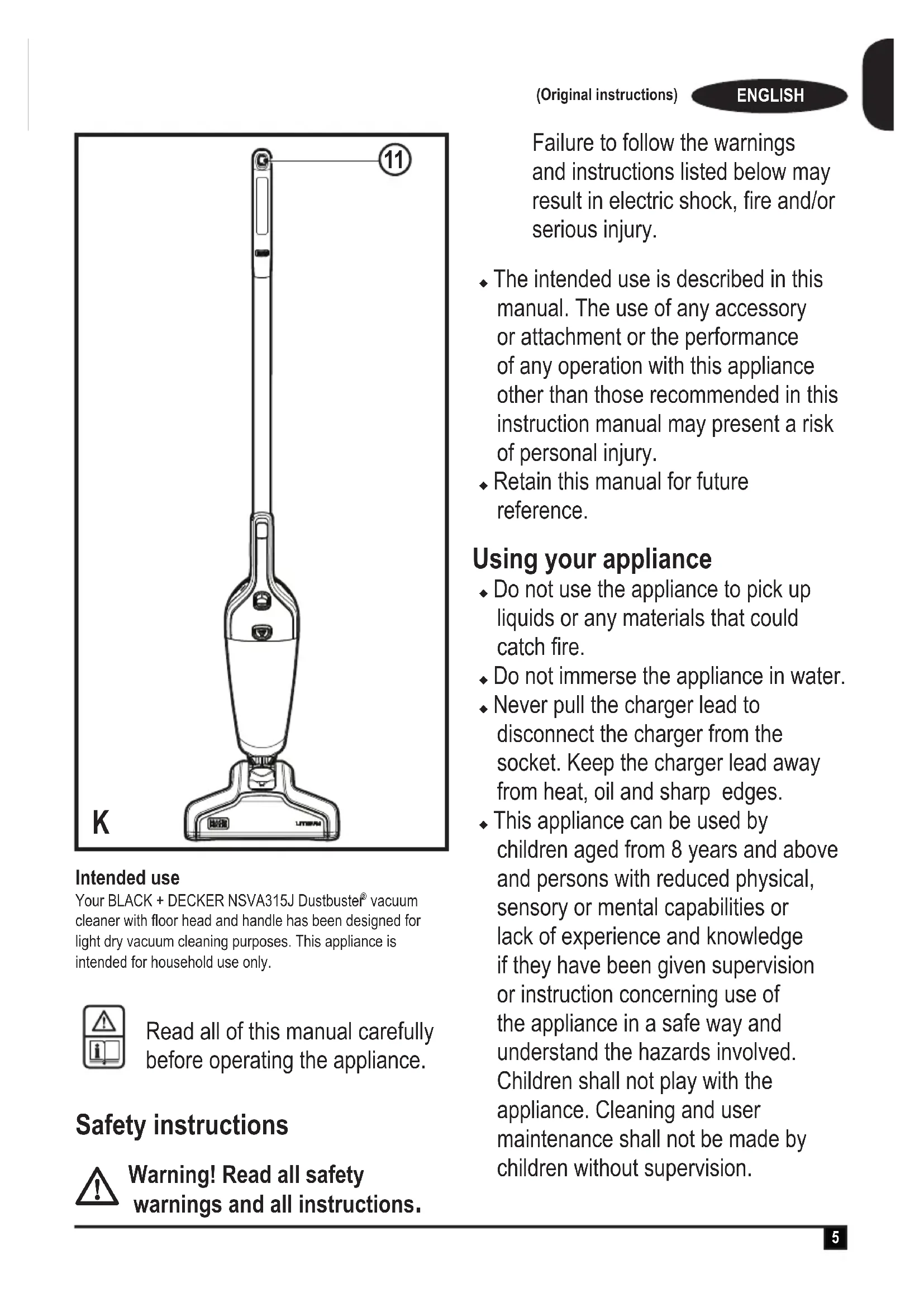 Intended use Your BLACK + DECKER NSVA315J Dustbuster vacuum cleaner with oor head and handle has been designed for light dry vacuum cleaning purposes. This appliance is intended for household use only. Read all of this manual carefully before operating the appliance. Safety instructions