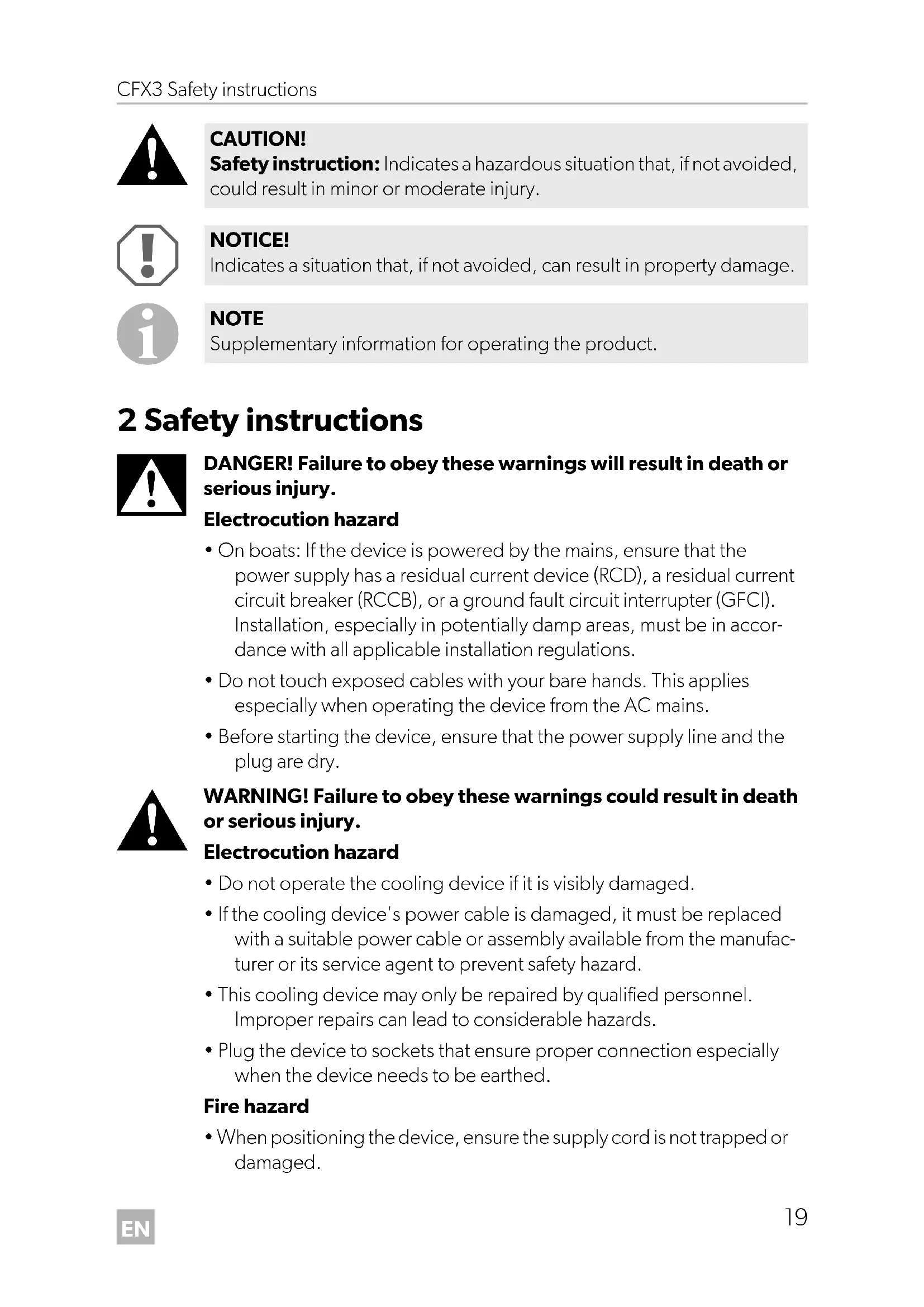 DANGER! Safety instruction: Indicates a hazardous situation that, if not avoided, will result in death or serious injury. WARNING! Safety instruction: Indicates a hazardous situation that, if not avoided, could result in death or serious injury.EN CFX3 Safety instructions