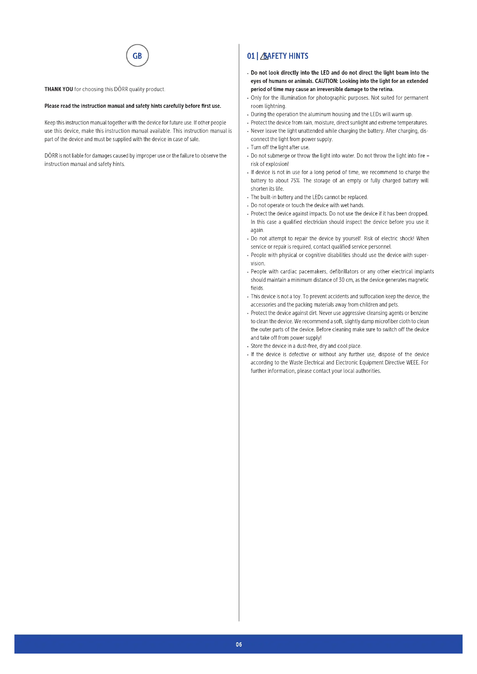 THANK YOU for choosing this DÖRR quality product. Please read the instruction manual and safety hints carefully before first use. Keep this instruction manual together with the device for future use. If other people use this device, make this instruction manual available. This instruction manual is part of the device and must be supplied with the device in case of sale. DÖRR is not liable for damages caused by improper use or the failure to observe the instruction manual and safety hints. 01 | SAFETY HINTS