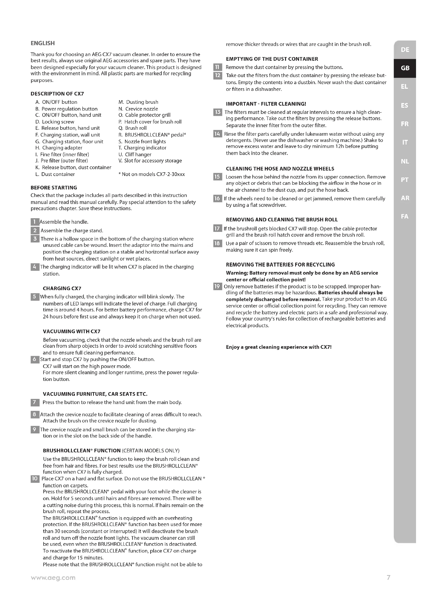 FAENGLISH Thank you for choosing an AEG CX7 vacuum cleaner. In order to ensure the best results, always use original AEG accessories and spare parts. They have been designed especially for your vacuum cleaner. This product is designed with the environment in mind. All plastic parts are marked for recycling purposes.