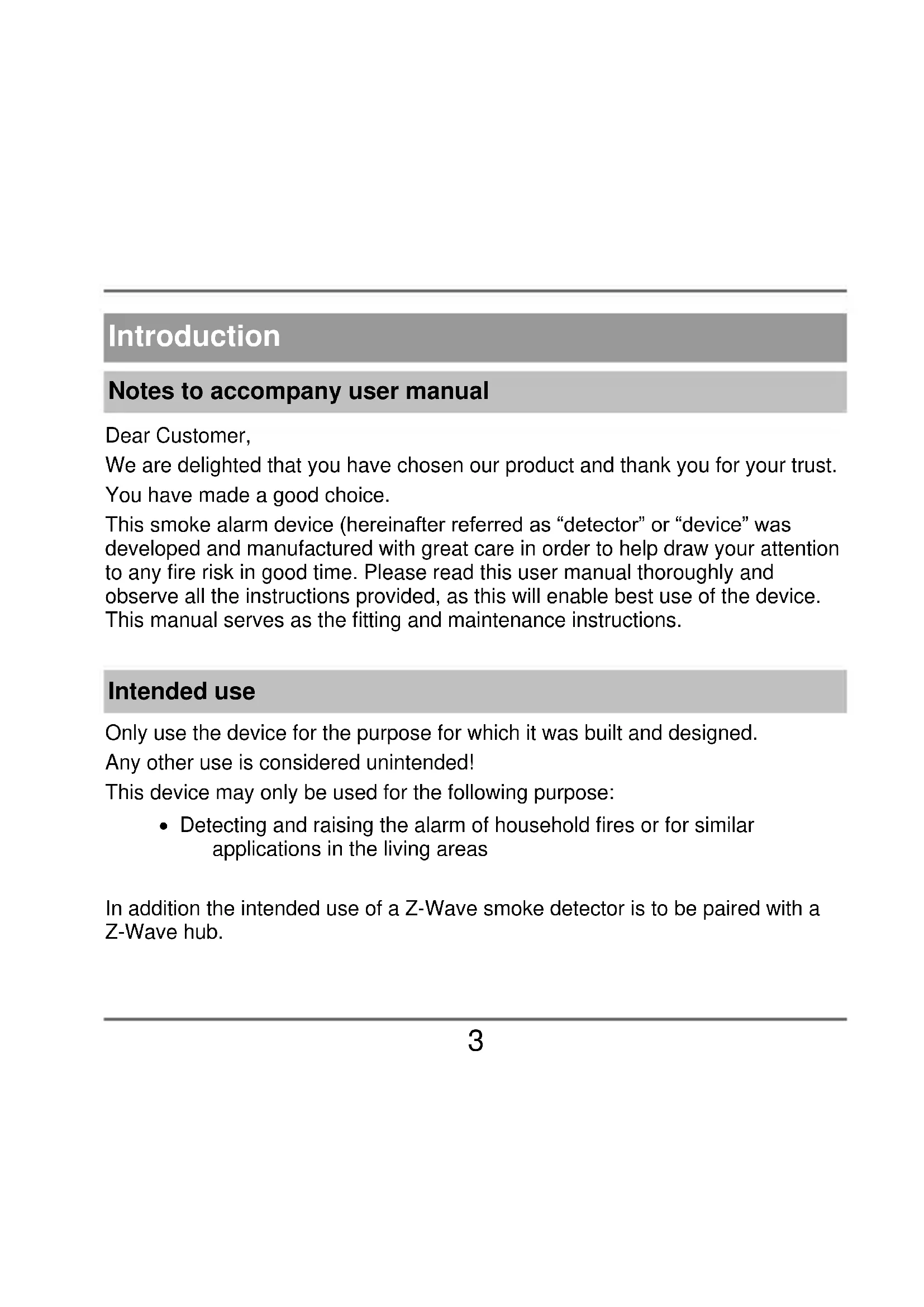 - Declaration of performance Introduction Notes to accompany user manual Dear Customer, We are delighted that you have chosen our product and thank you for your trust. You have made a good choice. This smoke alarm device (hereinafter referred as “detector” or “device” was developed and manufactured with great care in order to help draw your attention to any fire risk in good time. Please read this user manual thoroughly and observe all the instructions provided, as this will enable best use of the device. This manual serves as the fitting and maintenance instructions. Intended use Only use the device for the purpose for which it was built and designed. Any other use is considered unintended! This device may only be used for the following purpose: Detecting and raising the alarm of household fires or for similar applications in the living areas In addition the intended use of a Z-Wave smoke detector is to be paired with a Z-Wave hub.4 Limitation of liability Your rights are limited to the repair or replacement of this product in its as- delivered condition. ABUS Security-Center does not assume liability for any special, incidental or consequential damages, including but not limited to Loss of revenue, loss of profit, restrictions in use of the software, loss or recovery of data, costs for replacement facilities, down times, damage to property and claims by third parties, including those arising from contractual or legal claims for recovery or those arising under damage legislation, notwithstanding other restricted or legally implicit warranty provisions or in cases where the limited warranty is not valid, the scope of liability of ABUS Security- Center is limited to the purchase price of the product. The contents of these instructions may be altered without prior notice © ABUS Security-Center GmbH & Co. KG, 03/20185 Safety information Explanation of symbols The following symbols are used in this manual and on the device: Symbol Signal word Meaning p. 263