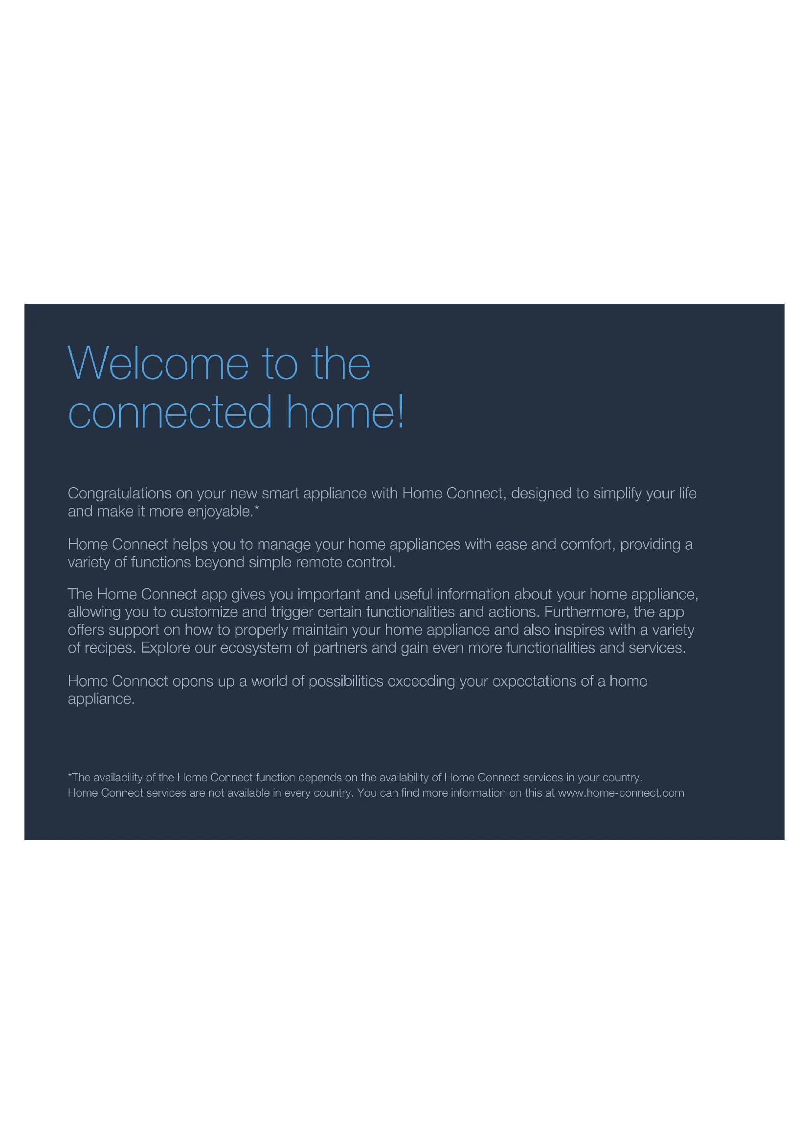 nicht mehr. Der Anmeldevorgang ist abgeschlossen. Hinweis: Wenn die Verbindung nicht hergestellt werden konnte, stellen Sie sicher, dass sich Ihr Smartphone/ Tablet in Reichweite Ihres Heimnetzwerks bendet.8 DE Congratulations on your new smart appliance with Home Connect, designed to simplify your life and make it more enjoyable.* Home Connect helps you to manage your home appliances with ease and comfort, providing a variety of functions beyond simple remote control. The Home Connect app gives you important and useful information about your home appliance, allowing you to customize and trigger certain functionalities and actions. Furthermore, the app oers support on how to properly maintain your home appliance and also inspires with a variety of recipes. Explore our ecosystem of partners and gain even more functionalities and services. Home Connect opens up a world of possibilities exceeding your expectations of a home appliance. *The availability of the Home Connect function depends on the availability of Home Connect services in your country. Home Connect services are not available in every country. You can nd more information on this at www.home-connect.com Welcome to the connected home!9 EN Explore: With the Home Connect app you can... Manage your appliance In the app’s appliance section you have an overview of your connected home appliances, oering a variety of functions beyond simple remote control. Monitor the home appliance’s progress, change or pause programs, change settings, trigger actions, and receive notications. Be inspired The recipe section provides a variety of inspiring recipes, tips and videos, that will make cooking and baking even more enjoyable. Get support The service section gives helpful information on how to maintain and operate your home appliance properly. Discover even more benets We are constantly expanding our ecosystems of partners. Please refer to www.home-connect.com for an overview of all partners. Let’s get started: What you need 1 | Your extractor hood must be installed properly and plugged in. 2 | A smartphone or tablet equipped with a current version of iOS or Android operating system. 3 | Your extractor hood within the Wi-Fi signal of your home network. 4 | The name of your Wi-Fi network (SSID) and its password (key). 5 | This installation guide. Important Information: Data security: Home Connect values customer data, ensuring the transfer of data is encrypted. Home Connect utilizes a variety of security measures, which are periodically reviewed. For further information visit www.home-connect.com. Appliance safety: To ensure safe operation of your appliance with Home Connect functionality, please consult the safety information in the appliance instruction manual.10 EN Step 2: Connect your extractor hood to your home network 1 | Your extractor hood must be installed properly and plugged in. 2 | Open your Home Connect app to add your extractor hood. 3 | Please follow the directions in the app and refer to this guide only when prompted to by the app. Information: We are constantly working to improve the Home Connect app, which may lead to dierences in the setup steps. Please rely on the instructions in the latest version of the Home Connect app to guide you through the setup process. Step 1: Download the Home Connect app and create a user account 1 | Open the App Store (Apple devices) or Google Play Store (Android devices) on your smartphone or tablet. 2 | Search for "Home Connect" in the Store and install the app. Home Connect app: 3 | Open the app and register yourself so that you can create a Home Connect user account. 4 | Make a note of your Home Connect access data (user account and password) – you will need this later. The app will take you through the necessary steps for linking your appliance with Home Connect. If necessary, the app will refer to these instructions.11 EN Step 2.1: Connect your extractor hood to your home network with WPS Please enter step 2.1 only when prompted to by the app. The following steps describe operations at the home appliance itself. Note: To connect the extractor hood to your home network, the hood and the light must be switched o. You can cancel the process at any time by pressing