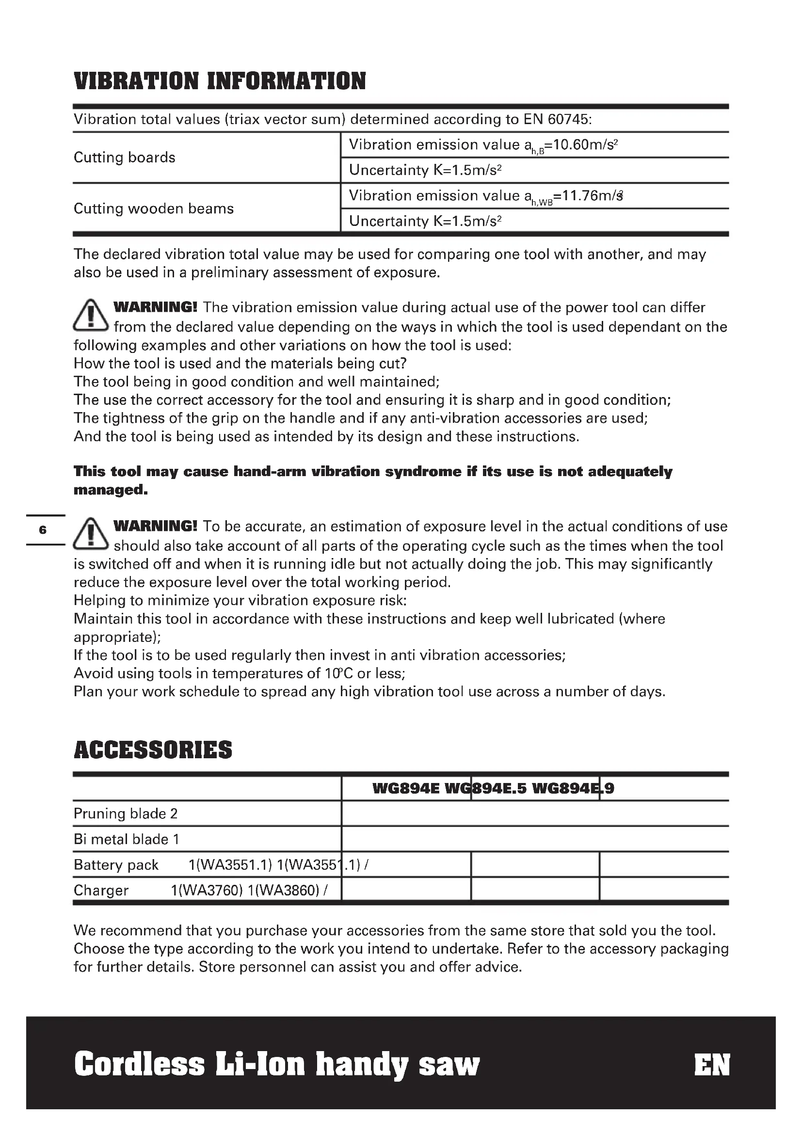 C or less; Plan your work schedule to spread any high vibration tool use across a number of days. ACCESSORIES WG894E WG894E.5 WG894E.9 Pruning blade 2 Bi metal blade 1 Battery pack 1(WA3551.1) 1(WA3551.1) / Charger 1(WA3760) 1(WA3860) / We recommend that you purchase your accessories from the same store that sold you the tool. Choose the type according to the work you intend to undertake. Refer to the accessory packaging for further details. Store personnel can assist you and offer advice.7 Cordless Li-Ion handy saw