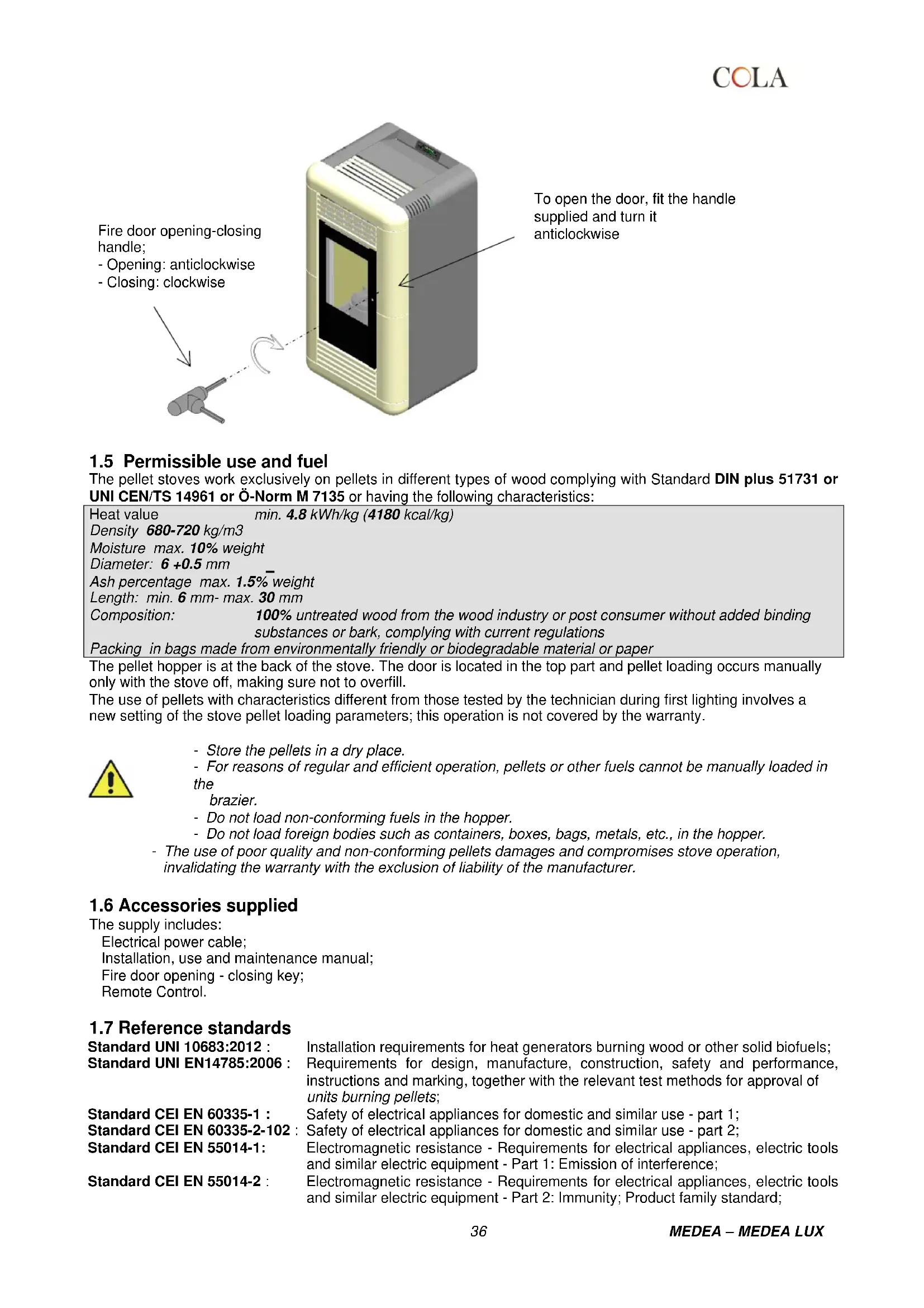 Standard UNI 10683:2012 : Installation requirements for heat generators burning wood or other solid biofuels; Standard UNI EN14785:2006 : Requirements for design, manufacture, construction, safety and performance, instructions and marking, together with the relevant test methods for approval of units burning pellets; Standard CEI EN 60335-1 : Safety of electrical appliances for domestic and similar use - part 1; Standard CEI EN 60335-2-102 : Safety of electrical appliances for domestic and similar use - part 2; Standard CEI EN 55014-1: Electromagnetic resistance - Requirements for electrical appliances, electric tools and similar electric equipment - Part 1: Emission of interference; Standard CEI EN 55014-2 : Electromagnetic resistance - Requirements for electrical appliances, electric tools and similar electric equipment - Part 2: Immunity; Product family standard; To open the door, fit the handle supplied and turn it anticlockwise Fire door opening-closing handle; - Opening: anticlockwise - Closing: clockwise37 MEDEA – MEDEA LUX Standard CEI EN 61000-3-2 : Limits for harmonic current emissions (Input current ≤16 A per phase); Standard CEI EN 61000-3-3 : Limitation of voltage fluctuations and flicker in low voltage supply systems for equipment with nominal current ≤ 16 A; Standard CEI EN 62233 : Measuring methods for electromagnetic fields of electrical household appliances and similar with reference to human exposure. Standards DIN plus 51731 – UNI CEN/TS 14961 - Ö-Norm M 7135 : Standards regarding the specifications and classification of pellets.