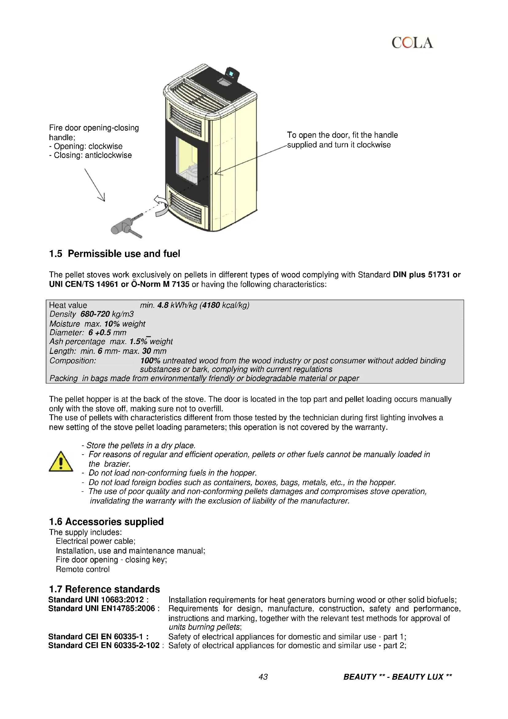 Standard UNI 10683:2012 : Installation requirements for heat generators burning wood or other solid biofuels; Standard UNI EN14785:2006 : Requirements for design, manufacture, construction, safety and performance, instructions and marking, together with the relevant test methods for approval of units burning pellets; Standard CEI EN 60335-1 : Safety of electrical appliances for domestic and similar use - part 1; Standard CEI EN 60335-2-102 : Safety of electrical appliances for domestic and similar use - part 2; To open the door, fit the handle supplied and turn it clockwise Fire door opening-closing handle; - Opening: clockwise - Closing: anticlockwise44 BEAUTY ** - BEAUTY LUX ** Standard CEI EN 55014-1: Electromagnetic resistance - Requirements for electrical appliances, electric tools and similar electric equipment - Part 1: Emission of interference; Standard CEI EN 55014-2 : Electromagnetic resistance - Requirements for electrical appliances, electric tools and similar electric equipment - Part 2: Immunity; Product family standard; Standard CEI EN 61000-3-2 : Limits for harmonic current emissions (Input current ≤16 A per phase); Standard CEI EN 61000-3-3 : Limitation of voltage fluctuations and flicker in low voltage supply systems for equipment with nominal current ≤ 16 A; Standard CEI EN 62233 : Measuring methods for electromagnetic fields of electrical household appliances and similar with reference to human exposure. Standards DIN plus 51731 – UNI CEN/TS 14961 - Ö-Norm M 7135 : Standards regarding the specifications and classification of pellets.