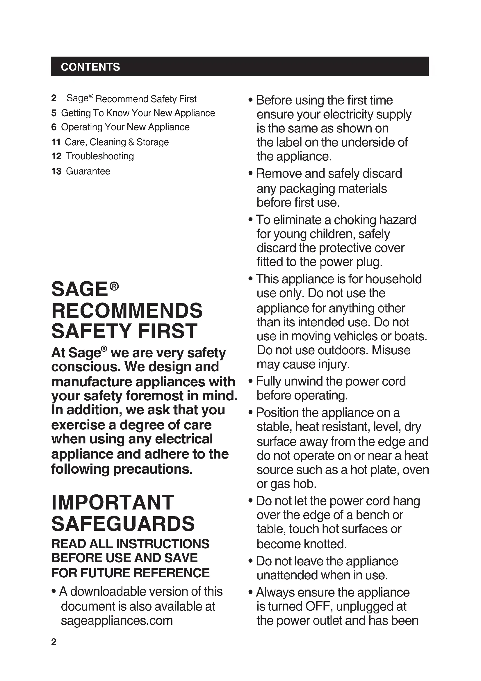 At Sage® we are very safety conscious. We design and manufacture appliances with your safety foremost in mind. In addition, we ask that you exercise a degree of care when using any electrical appliance and adhere to the following precautions.