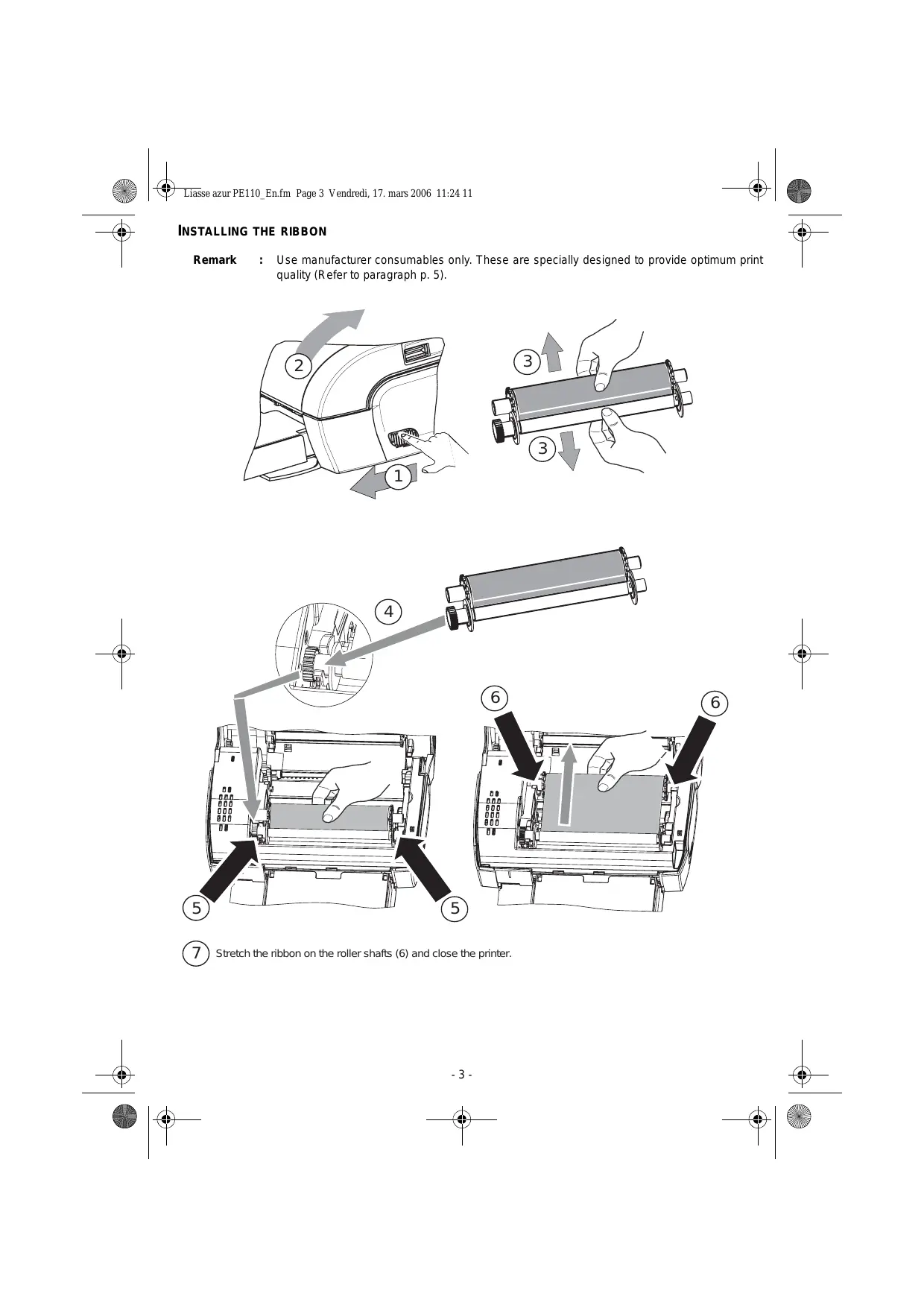 Stretch the ribbon on the roller shafts (6) and close the printer.