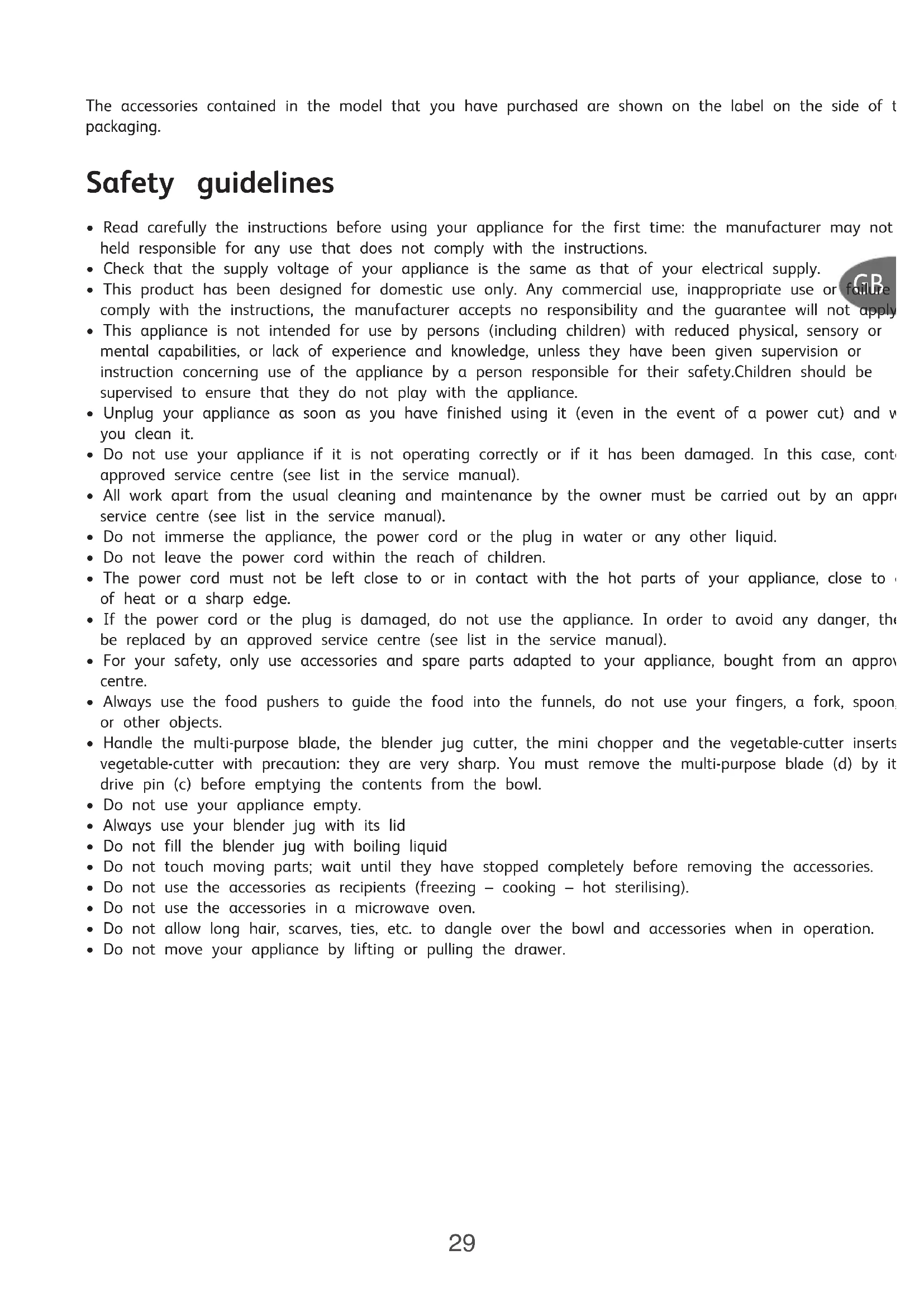 - For your safety, only use accessories and spare parts adapted to your appliance, bought from an approved centre.