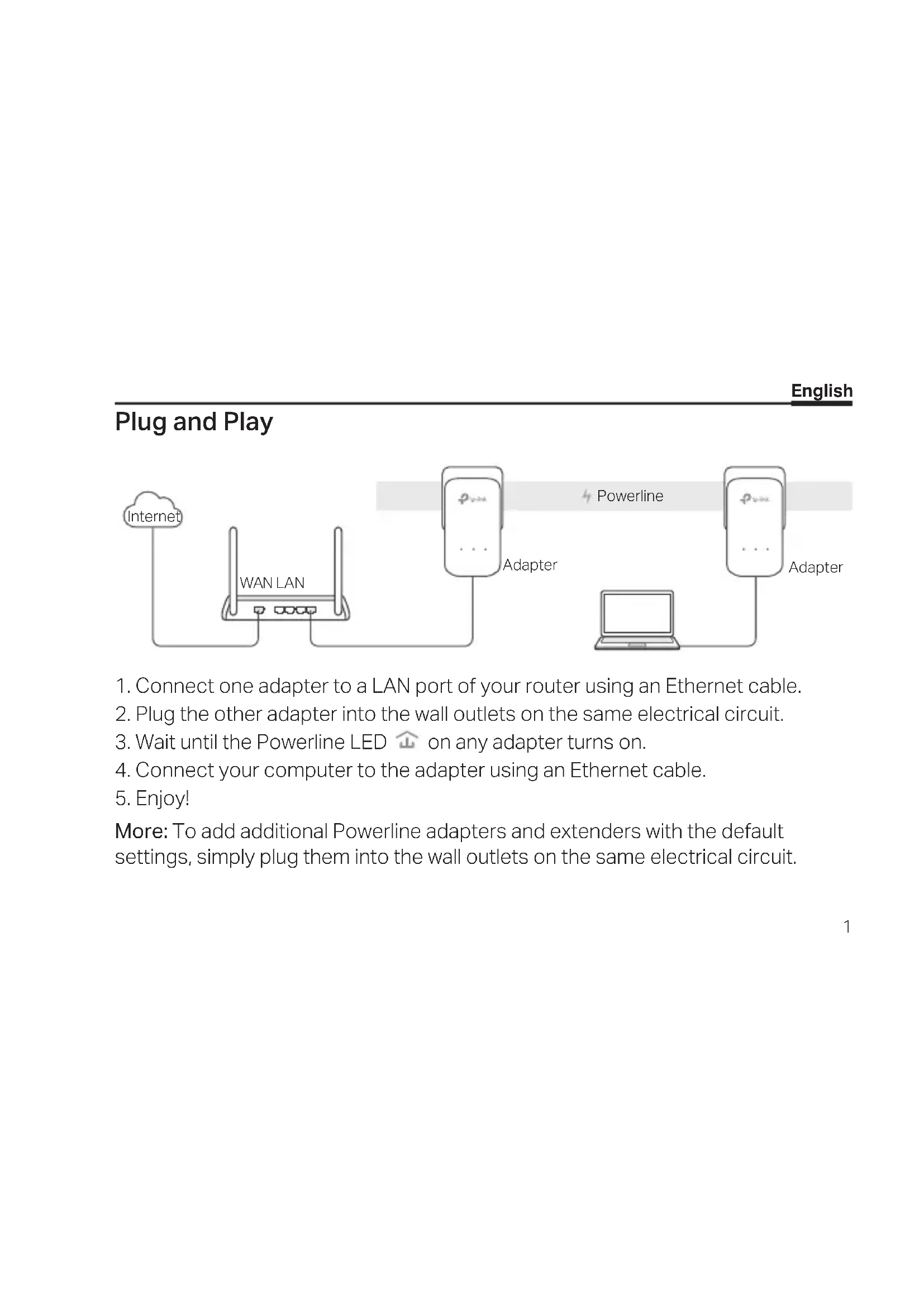 More: To add additional Powerline adapters and extenders with the default settings, simply plug them into the wall outlets on the same electrical circuit. Internet WAN LAN Adapter Adapter PowerlineEnglish