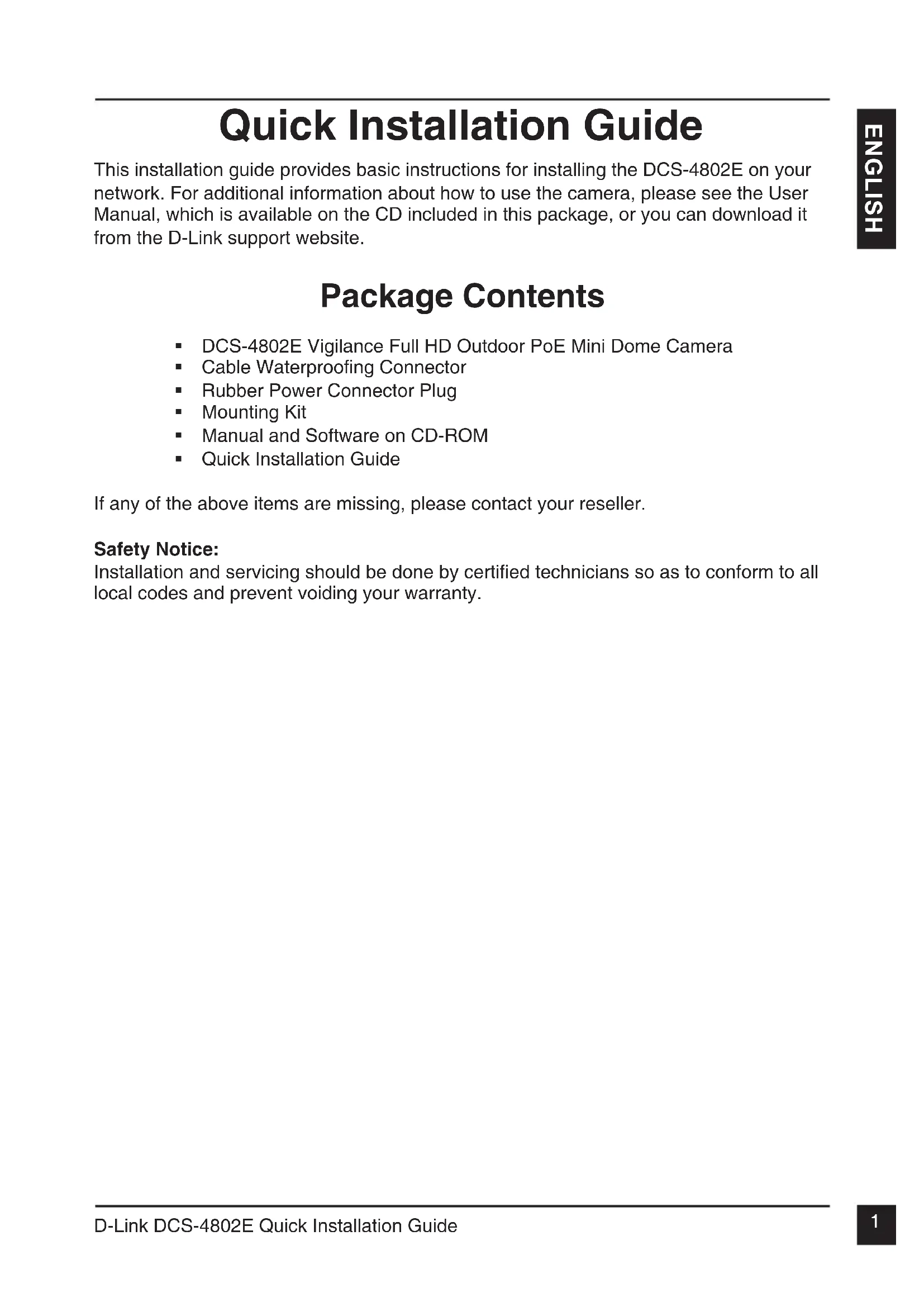 ENGLISH Quick Installation Guide This installation guide provides basic instructions for installing the DCS-4802E on your network. For additional information about how to use the camera, please see the User Manual, which is available on the CD included in this package, or you can download it from the D-Link support website. Package Contents DCS-4802E Vigilance Full HD Outdoor PoE Mini Dome Camera Cable Waterproong Connector Rubber Power Connector Plug Mounting Kit Manual and Software on CD-ROM Quick Installation Guide If any of the above items are missing, please contact your reseller. Safety Notice: Installation and servicing should be done by certied technicians so as to conform to all local codes and prevent voiding your warranty.D-Link DCS-4802E Quick Installation Guide