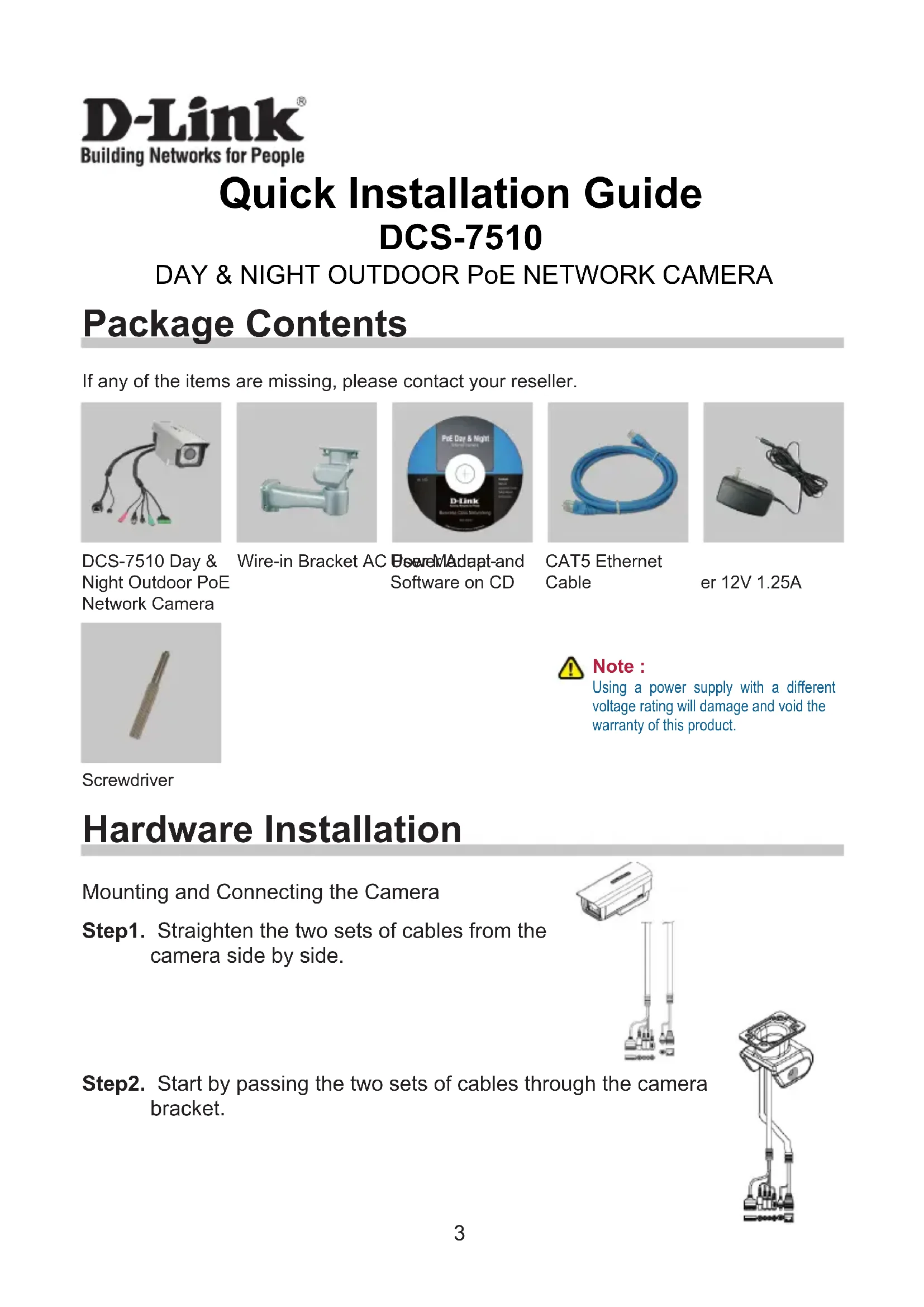 Day & Night OutDOOr PoE NEtwOrk CamEra DCS-7510 Quick Installation Guide+ Installations-Anleitung+ Guide d’installation+ Guía de instalación+ Guida di Installazione+33 Quick Installation Guide DCS-7510 DCS-7510 Day & Night Outdoor PoE Network CameraWire-in Bracket AC Power Adapt-er 12V 1.25AIf any of the items are missing, please contact your reseller. DAY & NIGHT OUTDOOR PoE NETWORK CAMERA ScrewdriverUser Manual and Software on CDCAT5 Ethernet Cable Mounting and Connecting the Camera Step1. Straighten the two sets of cables from the camera side by side. Step2. Start by passing the two sets of cables through the camera bracket. Package Contents Hardware Installation Note :Using a power supply with a different voltage rating will damage and void the warranty of this product.4