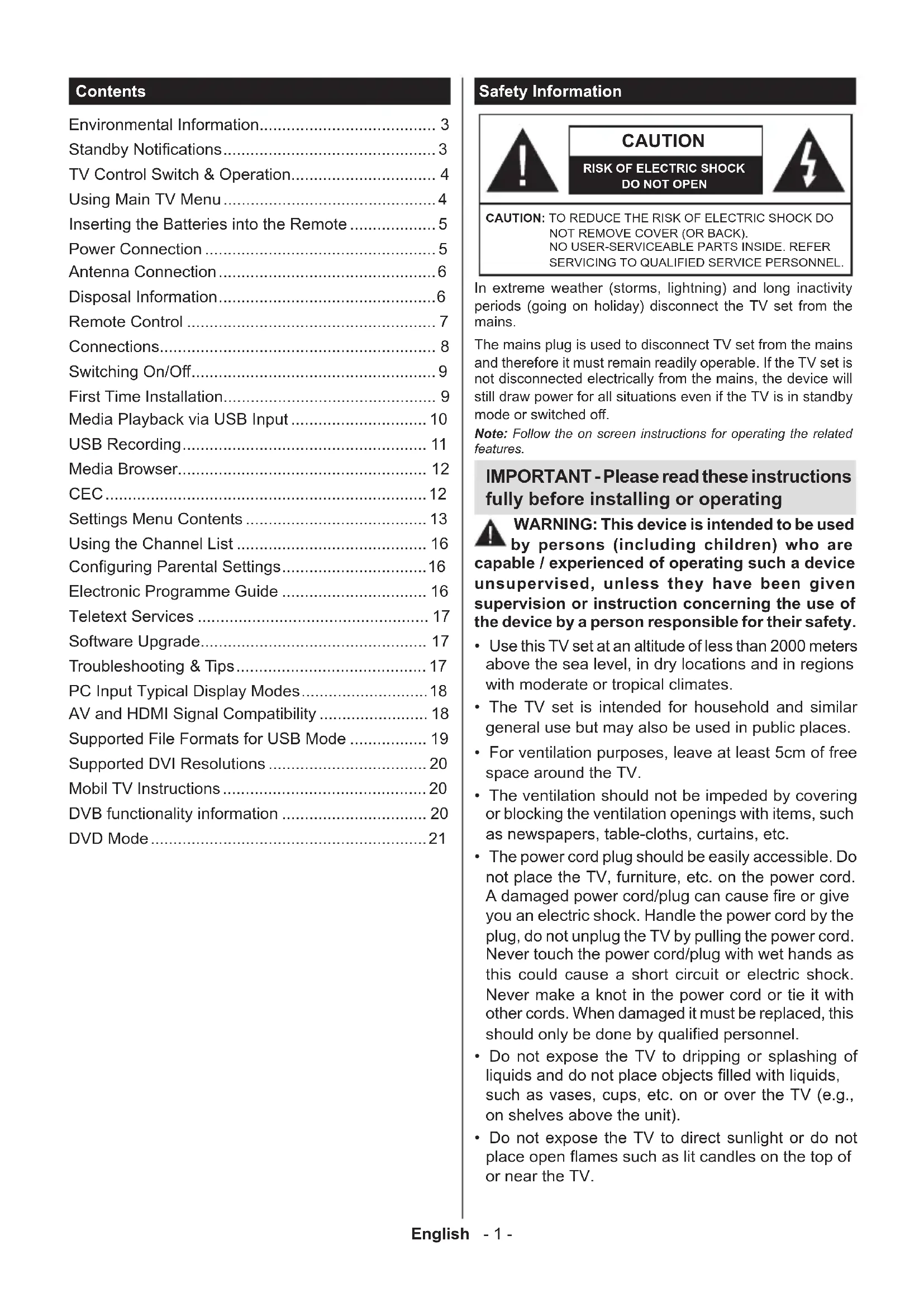 - Do not expose the TV to direct sunlight or do not place open ames such as lit candles on the top of or near the TV. Contents Environmental Information....................................... 3 Standby Notications ............................................... 3 TV Control Switch & Operation................................ 4 Using Main TV Menu ............................................... 4 Inserting the Batteries into the Remote ................... 5 Power Connection ................................................... 5 Antenna Connection ................................................ 6 Disposal Information ................................................ 6 Remote Control ....................................................... 7 Connections............................................................. 8 Switching On/O ...................................................... 9 First Time Installation............................................... 9 Media Playback via USB Input .............................. 10 USB Recording ...................................................... 11 Media Browser....................................................... 12 CEC ....................................................................... 12 Settings Menu Contents ........................................ 13 Using the Channel List .......................................... 16 Conguring Parental Settings ................................ 16 Electronic Programme Guide ................................ 16 Teletext Services ................................................... 17 Software Upgrade.................................................. 17 Troubleshooting & Tips .......................................... 17 PC Input Typical Display Modes ............................ 18 AV and HDMI Signal Compatibility ........................ 18 Supported File Formats for USB Mode ................. 19 Supported DVI Resolutions ................................... 20 Mobil TV Instructions ............................................. 20 DVB functionality information ................................ 20 DVD Mode ............................................................. 21English - 2 -
