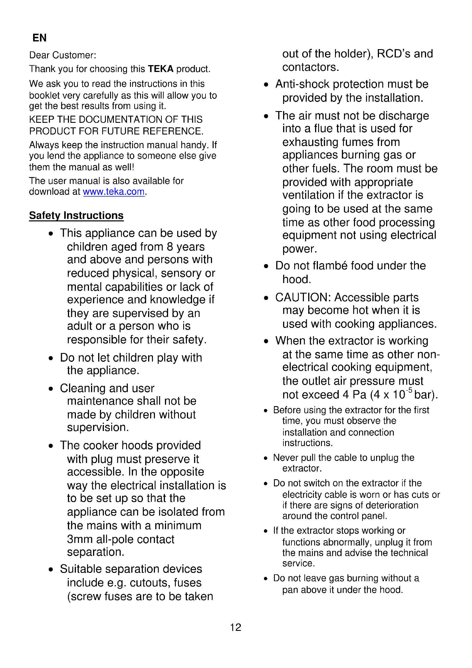 PRODUCT FOR FUTURE REFERENCE. Always keep the instruction manual handy. If you lend the appliance to someone else give them the manual as well! The user manual is also available for download at www.teka.com. Safety Instructions This appliance can be used by children aged from 8 years and above and persons with reduced physical, sensory or mental capabilities or lack of experience and knowledge if they are supervised by an adult or a person who is responsible for their safety. Do not let children play with the appliance. Cleaning and user maintenance shall not be made by children without supervision. The cooker hoods provided with plug must preserve it accessible. In the opposite way the electrical installation is to be set up so that the appliance can be isolated from the mains with a minimum 3mm all-pole contact separation. Suitable separation devices include e.g. cutouts, fuses (screw fuses are to be taken out of the holder), RCD’s and contactors. Anti-shock protection must be provided by the installation. The air must not be discharge into a flue that is used for exhausting fumes from appliances burning gas or other fuels. The room must be provided with appropriate ventilation if the extractor is going to be used at the same time as other food processing equipment not using electrical power. Do not flambé food under the hood. CAUTION: Accessible parts may become hot when it is used with cooking appliances. When the extractor is working at the same time as other non- electrical cooking equipment, the outlet air pressure must not exceed 4 Pa (4 x 10