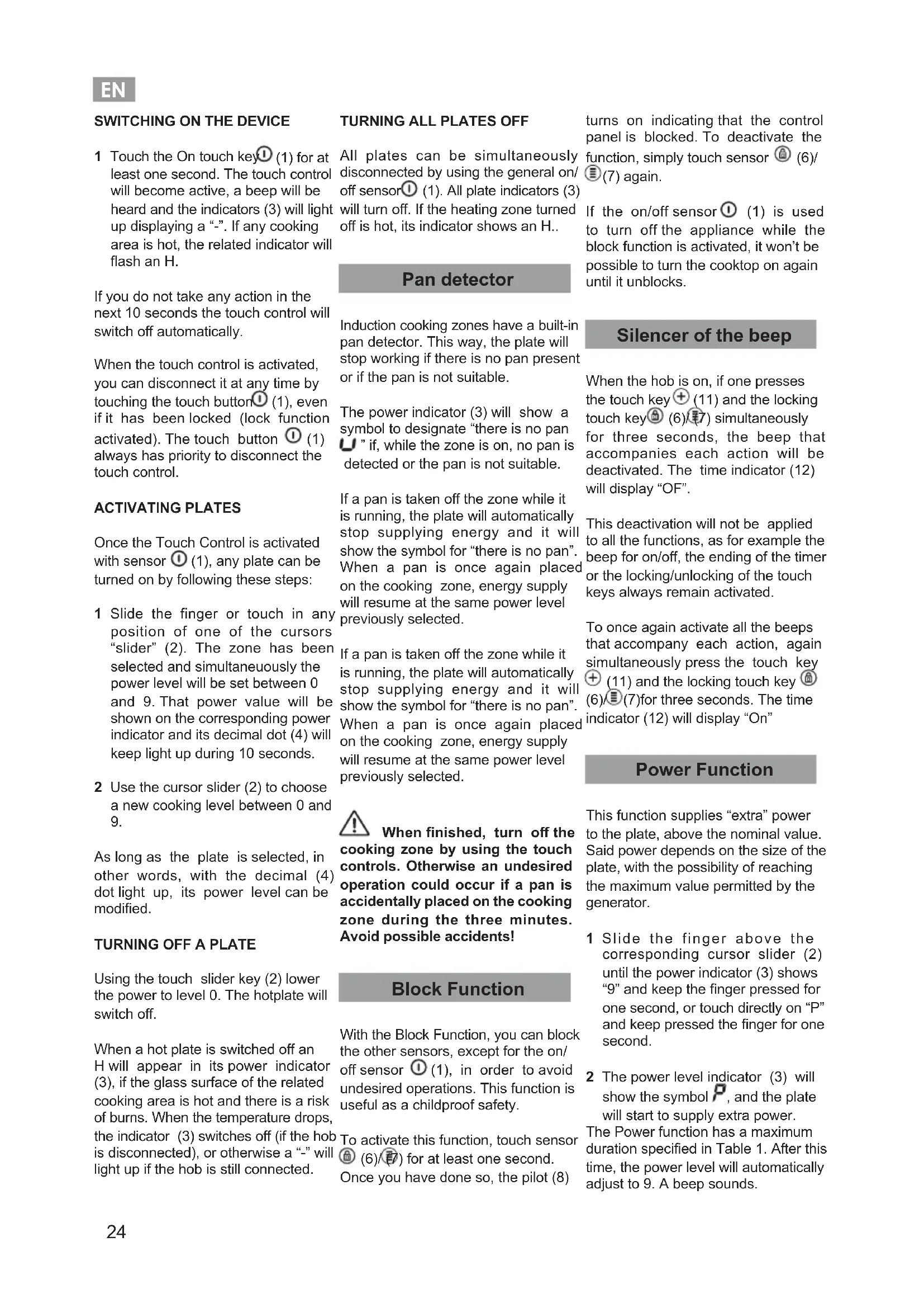 All plates can be simultaneously disconnected by using the general on/ o sensor (1). All plate indicators (3) will turn o. If the heating zone turned o is hot, its indicator shows an H.. Pan detector Induction cooking zones have a built-in pan detector. This way, the plate will stop working if there is no pan present or if the pan is not suitable. The power indicator (3) will show a symbol to designate “there is no pan ” if, while the zone is on, no pan is detected or the pan is not suitable. If a pan is taken o the zone while it is running, the plate will automatically stop supplying energy and it will show the symbol for “there is no pan”. When a pan is once again placed on the cooking zone, energy supply will resume at the same power level previously selected. If a pan is taken o the zone while it is running, the plate will automatically stop supplying energy and it will show the symbol for “there is no pan”. When a pan is once again placed on the cooking zone, energy supply will resume at the same power level previously selected. When nished, turn o the cooking zone by using the touch controls. Otherwise an undesired operation could occur if a pan is accidentally placed on the cooking zone during the three minutes. Avoid possible accidents! Block Function With the Block Function, you can block the other sensors, except for the on/ o sensor (1), in order to avoid undesired operations. This function is useful as a childproof safety. To activate this function, touch sensor (6)/ (7) for at least one second. Once you have done so, the pilot (8) turns on indicating that the control panel is blocked. To deactivate the function, simply touch sensor (6)/ (7) again. If the on/off sensor (1) is used to turn off the appliance while the block function is activated, it won’t be possible to turn the cooktop on again until it unblocks. Silencer of the beep When the hob is on, if one presses the touch key (11) and the locking touch key (6)/ (7) simultaneously for three seconds, the beep that accompanies each action will be deactivated. The time indicator (12) will display “OF”. This deactivation will not be applied to all the functions, as for example the beep for on/o, the ending of the timer or the locking/unlocking of the touch keys always remain activated. To once again activate all the beeps that accompany each action, again simultaneously press the touch key (11) and the locking touch key (6)/ (7)for three seconds. The time indicator (12) will display “On” Power Function This function supplies “extra” power to the plate, above the nominal value. Said power depends on the size of the plate, with the possibility of reaching the maximum value permitted by the generator. 1 Slide the finger above the corresponding cursor slider (2) until the power indicator (3) shows “9” and keep the nger pressed for one second, or touch directly on “P” and keep pressed the nger for one second. 2 The power level indicator (3) will show the symbol , and the plate will start to supply extra power. The Power function has a maximum duration specied in Table 1. After this time, the power level will automatically adjust to 9. A beep sounds.EN