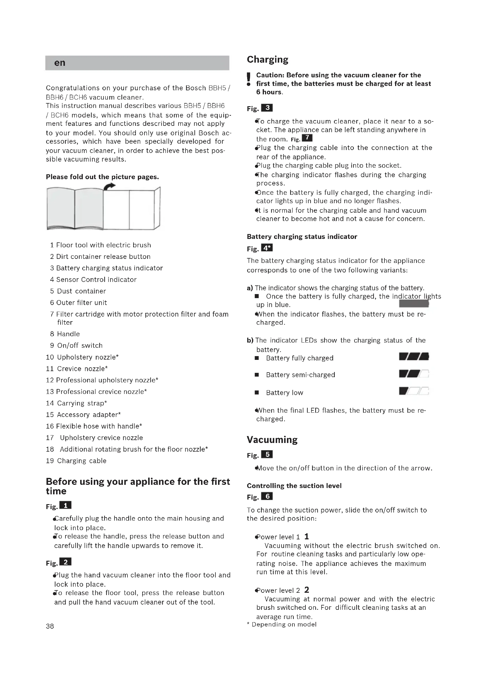- je nach Ausstattung38 Congratulations on your purchase of the Bosch BBH5 / BBH6 / BCH6 vacuum cleaner. This instruction manual describes various BBH5 / BBH6 / BCH6 models, which means that some of the equip- ment features and functions described may not apply to your model. You should only use original Bosch ac- cessories, which have been specially developed for your vacuum cleaner, in order to achieve the best pos- sible vacuuming results. Please fold out the picture pages. 1 Floor tool with electric brush 2 Dirt container release button 3 Battery charging status indicator 4 Sensor Control indicator 5 Dust container 6 Outer filter unit 7 Filter cartridge with motor protection filter and foam filter 8 Handle 9 On/off switch 10 Upholstery nozzle* 11 Crevice nozzle* 12 Professional upholstery nozzle* 13 Professional crevice nozzle* 14 Carrying strap* 15 Accessory adapter* 16 Flexible hose with handle* 17 Upholstery crevice nozzle 18 Additional rotating brush for the floor nozzle* 19 Charging cable Before using your appliance for the first time Fig.