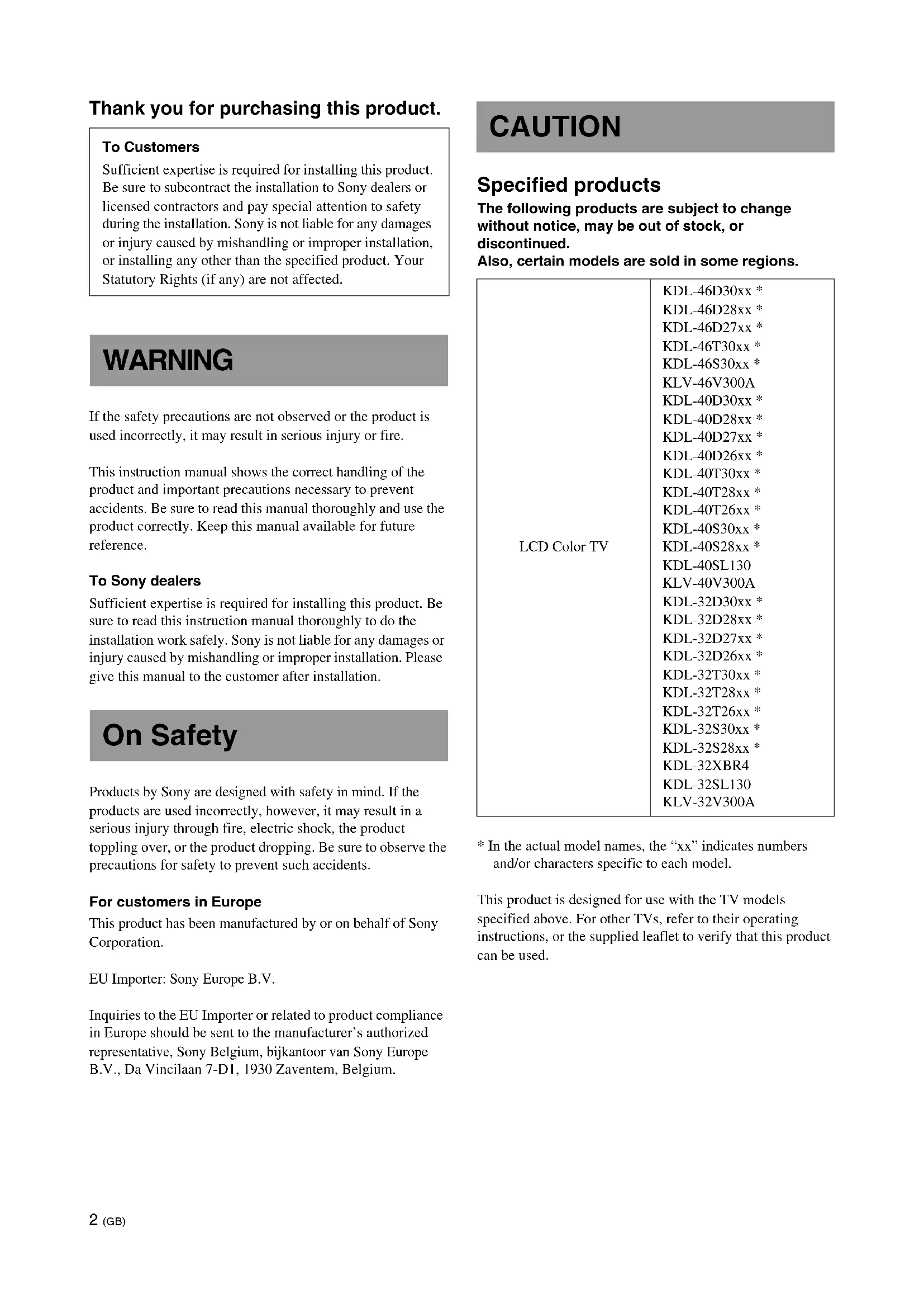 - In the actual model names, the “xx” indicates numbers and/or characters specific to each model. This product is designed for use with the TV models specified above. For other TVs, refer to their operating instructions, or the supplied leaflet to verify that this product can be used. To Customers Sufficient expertise is required for installing this product. Be sure to subcontract the installation to Sony dealers or licensed contractors and pay special attention to safety during the installation. Sony is not liable for any damages or injury caused by mishandling or improper installation, or installing any other than the specified product. Your Statutory Rights (if any) are not affected. WARNING On Safety CAUTION LCD Color TV KDL-46D30xx * KDL-46D28xx * KDL-46D27xx * KDL-46T30xx * KDL-46S30xx *