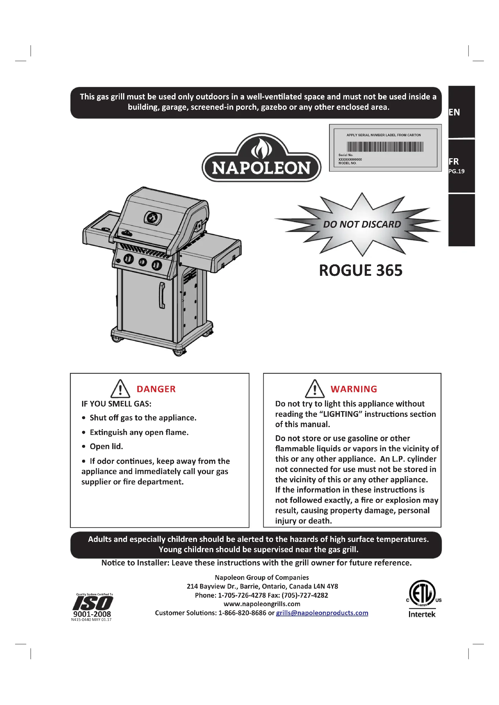 Quality System Cerfied To 9001-2008 Noce to Installer: Leave these instrucons with the grill owner for future reference. Adults and especially children should be alerted to the hazards of high surface temperatures. Young children should be supervised near the gas grill. Napoleon Group of Companies214 Bayview Dr., Barrie, Ontario, Canada L4N 4Y8 Phone: 1-705-726-4278 Fax: (705)-727-4282www.napoleongrills.com Customer Soluons: 1-866-820-8686 or grills@napoleonproducts.com ROGUE 365www.napoleongrills.com