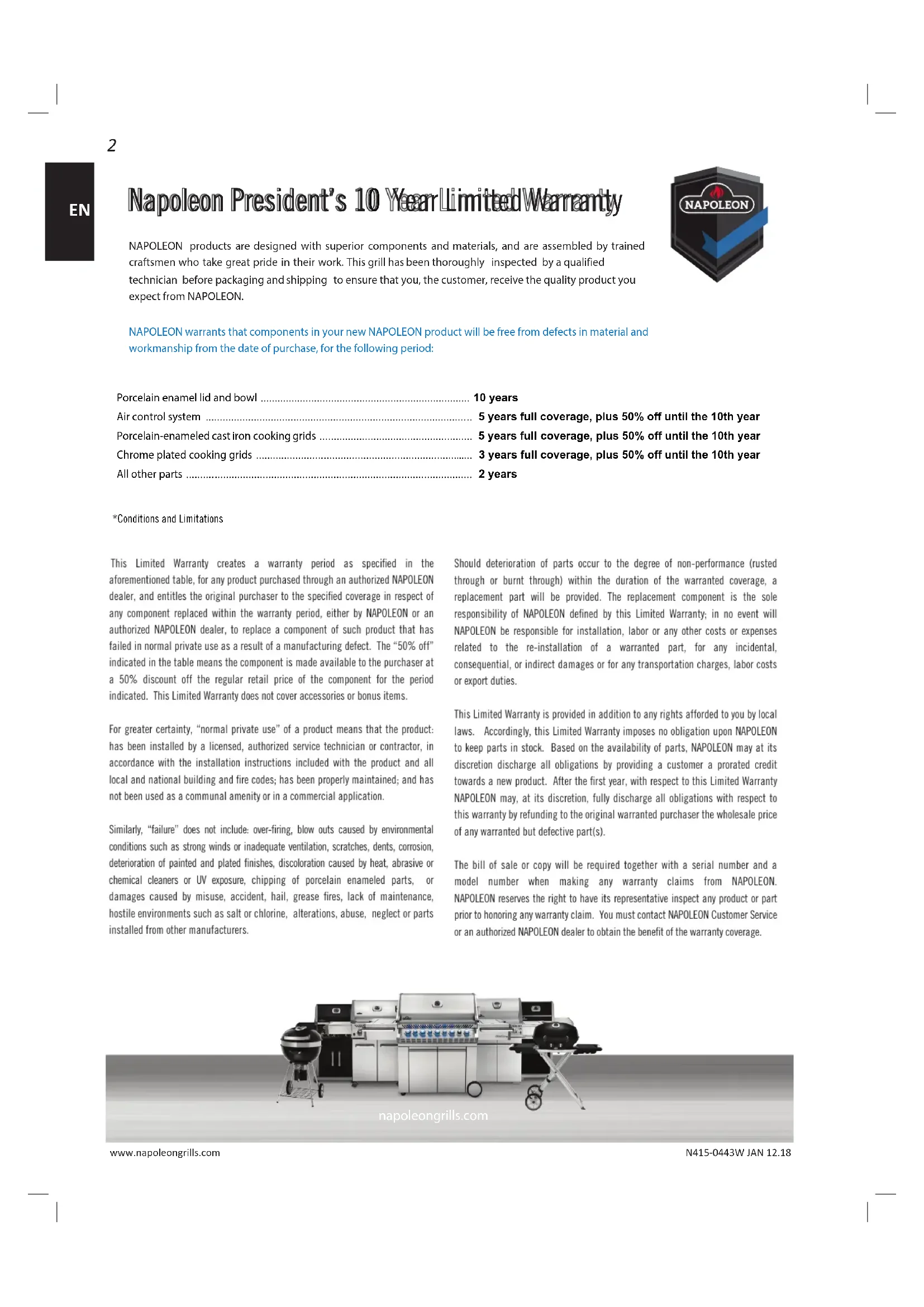 - This Limited Warranty creates a warranty period as specified in the aforementioned table, for any product purchased through an authorized NAPOLEON dealer, and entitles the original purchaser to the specified coverage in respect of any component replaced within the warranty period, either by NAPOLEON or an authorized NAPOLEON dealer, to replace a component of such product that has failed in normal private use as a result of a manufacturing defect. The “50% off” indicated in the table means the component is made available to the purchaser at a 50% discount off the regular retail price of the component for the period indicated. This Limited Warranty does not cover accessories or bonus items. For greater certainty, “normal private use” of a product means that the product: has been installed by a licensed, authorized service technician or contractor, in accordance with the installation instructions included with the product and all local and national building and fire codes; has been properly maintained; and has not been used as a communal amenity or in a commercial application. Similarly, “failure” does not include: over-firing, blow outs caused by environmental conditions such as strong winds or inadequate ventilation, scratches, dents, corrosion, deterioration of painted and plated finishes, discoloration caused by heat, abrasive or chemical cleaners or UV exposure, chipping of porcelain enameled parts, or damages caused by misuse, accident, hail, grease fires, lack of maintenance, hostile environments such as salt or chlorine, alterations, abuse, neglect or parts installed from other manufacturers. Should deterioration of parts occur to the degree of non-performance (rusted through or burnt through) within the duration of the warranted coverage, a replacement part will be provided. The replacement component is the sole responsibility of NAPOLEON defined by this Limited Warranty; in no event will NAPOLEON be responsible for installation, labor or any other costs or expenses related to the re-installation of a warranted part, for any incidental, consequential, or indirect damages or for any transportation charges, labor costs or export duties. This Limited Warranty is provided in addition to any rights afforded to you by local laws. Accordingly, this Limited Warranty imposes no obligation upon NAPOLEON to keep parts in stock. Based on the availability of parts, NAPOLEON may at its discretion discharge all obligations by providing a customer a prorated credit towards a new product. After the first year, with respect to this Limited Warranty NAPOLEON may, at its discretion, fully discharge all obligations with respect to this warranty by refunding to the original warranted purchaser the wholesale price of any warranted but defective part(s). The bill of sale or copy will be required together with a serial number and a model number when making any warranty claims from NAPOLEON. NAPOLEON reserves the right to have its representative inspect any product or part prior to honoring any warranty claim. You must contact NAPOLEON Customer Service or an authorized NAPOLEON dealer to obtain the benefit of the warranty coverage. napoleongrills.com Napoleon President’s 10 Year Limited Warranty NAPOLEON products are designed with superior components and materials, and are assembled by trained craftsmen who take great pride in their work. This grill has been thoroughly inspected by a qualified technician before packaging and shipping to ensure that you, the customer, receive the quality product you expect from NAPOLEON. NAPOLEON warrants that components in your new NAPOLEON product will be free from defects in material and workmanship from the date of purchase, for the following period: *Conditions and Limitations Porcelain enamel lid and bowl p. 10
