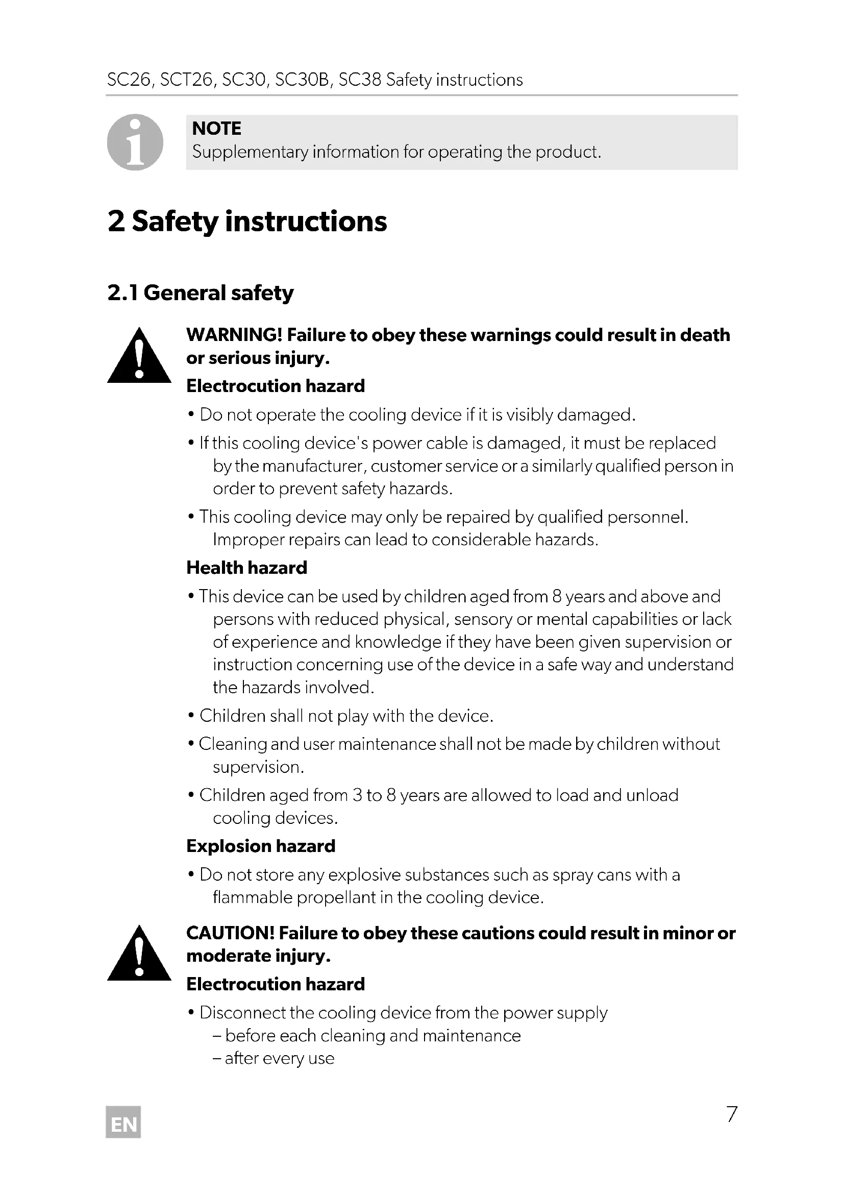 - Disconnect the cooling device from the power supply – before each cleaning and maintenance – after every use NOTE Supplementary information for operating the product. SC26-SCT26-SC30-SC38_OPM_EMEA16.book Seite 7 Mittwoch, 19. Juni 2019 8:51 20EN Safety instructions SC26, SCT26, SC30, SC30B, SC38