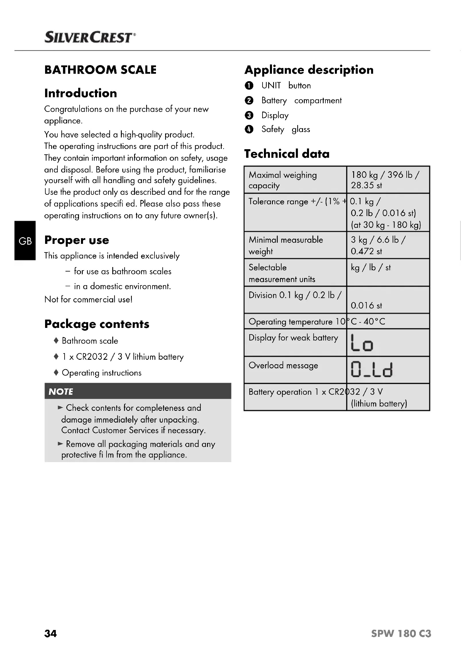 BATHROOM SCALE Introduction Congratulations on the purchase of your new appliance. You have selected a high-quality product. The operating instructions are part of this product. They contain important information on safety, usage and disposal. Before using the product, familiarise yourself with all handling and safety guidelines. Use the product only as described and for the range of applications specifi ed. Please also pass these operating instructions on to any future owner(s). Proper use This appliance is intended exclusively – for use as bathroom scales – in a domestic environment. Not for commer cial use! Package contents ♦ Bathroom scale ♦ 1 x CR2032 / 3 V lithium battery ♦ Operating instructions NOTE ► Check contents for completeness and damage immediately af ter unpacking. Contact Customer Services if necessary. ► Remove all packaging materials and any