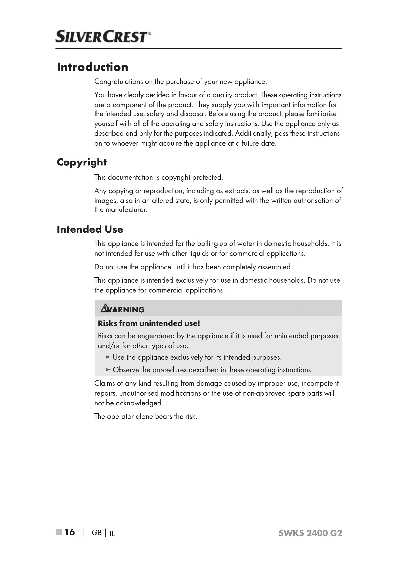 Introduction Congratulations on the purchase of your new appliance. You have clearly decided in favour of a quality product. These operating instructions are a component of the product. They supply you with important information for the intended use, safety and disposal. Before using the product, please familiarise yourself with all of the operating and safety instructions. Use the appliance only as described and only for the purposes indicated. Additionally, pass these instructions on to whoever might acquire the appliance at a future date. Copyright This documentation is copyright protected. Any copying or reproduction, including as extracts, as well as the reproduction of images, also in an altered state, is only permitted with the written authorisation of the manufacturer. Intended Use This appliance is intended for the boiling-up of water in domestic households. It is not intended for use with other liquids or for commercial applications. Do not use the appliance until it has been completely assembled. This appliance is intended exclusively for use in domestic households. Do not use the appliance for commercial applications! WARNING Risks from unintended use! Risks can be engendered by the appliance if it is used for unintended purposes and/or for other types of use. ► Use the appliance exclusively for its intended purposes. ► Observe the procedures described in these operating instructions. Claims of any kind resulting from damage caused by improper use, incompetent repairs, unauthorised modifications or the use of non-approved spare parts will not be acknowledged. The operator alone bears the risk.SWKS 2400 G2