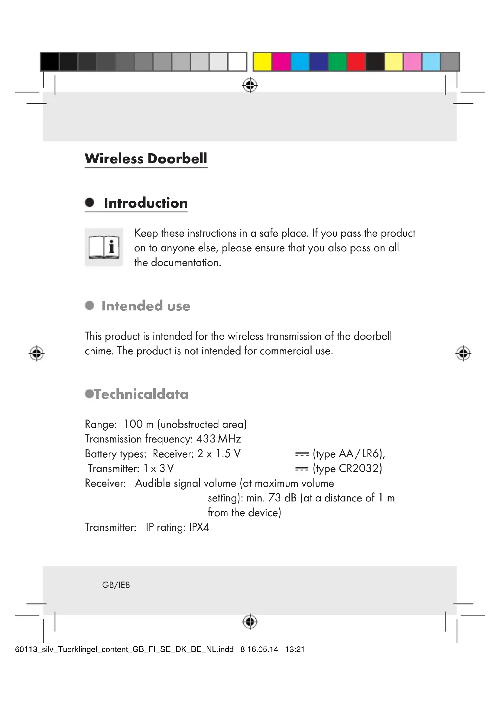 OF ACCIDENTS FOR TODDLERS AND CHILDREN! Never leave children alone and unsupervised with the packaging material. There is a risk of suffocation from the packaging material. Children often underestimate risks. Always keep children away from the product. This is not a toy. This appliance can be used by children aged from 8 years and above and persons with reduced physical, sensory or mental capabilities or lack of experience and knowledge if they have been given super- vision or instruction concerning use of the appliance in a safe way and understand the hazards involved. Children shall not play with the appliance. Cleaning and user maintenance shall not be made by children without supervision. Check that all parts are in sound condition. If you use damaged parts when assembling the device, you risk injury. Check that all parts have been assembled correctly. There is a risk of injury if the device is not properly assembled. Keep the device away from open flames or sources of heat (e.g. burning candles). 60113_silv_Tuerklingel_content_GB_FI_SE_DK_BE_NL.indd 11 16.05.14 13:21GB/IE12 Safety instructions for batteries DANGER TO LIFE! Batteries can be swallowed, which can prove fatal. Consult a doctor immediately if anyone swallows a battery. EXPLOSION HAZARD! Never recharge nonrecharge- able batteries, short-circuit and / or open batteries. This can cause them to overheat, burn or burst. Never throw batteries into fire or water. The batteries may explode. Immediately remove depleted batteries from the device; otherwise there will be an increased risk of leakage! Always replace all the batteries at the same time and insert batteries of the same type. Do not use different types of batteries or mix used and new batter- ies together. Batteries do not belong in household refuse. Dispose of used batteries in an environmentally friendly manner. Consumers are under a legal obligation to dispose of batteries in the proper way. Keep the battery out of the reach of children, do not dispose of the battery in fire, do not short-circuit it, and do not take it apart. Failure to observe these instructions may result in the battery discharging beyond its end voltage, which poses a risk of leakage. If the battery in your instrument has leaked, have it removed immediately to prevent damage to the instrument. 60113_silv_Tuerklingel_content_GB_FI_SE_DK_BE_NL.indd 12 16.05.14 13:21GB/IE 13 Avoid contact with skin, eyes and mucous membrane. In the event of contact with battery acid, rinse the affected area with plenty of water and / or consult a doctor. Never use rechargeable batteries. The supply terminals are not to be short-circuited. Do not mix old batteries with new ones. Remove the batteries from the device if they have not been used for a long period. Make sure you insert the batteries the right way round (polarity). Assembly Note: You will need a screwdriver and a drill to assemble the doorbell. Note: Only use the screws and dowels supplied for the assembly of the device. Mount the receiver (see Fig. E) Mount the transmitter (see Fig. F) Preparing for use Inserting / replacing the batteries Insert the batteries to provide power to the device before preparing it for use. 60113_silv_Tuerklingel_content_GB_FI_SE_DK_BE_NL.indd 13 16.05.14 13:21GB/IE14 CAUTION! Use the above-indicated battery types only. Failure to observe this advice may result in damage to the product. Receiver: Remove the battery compartment cover