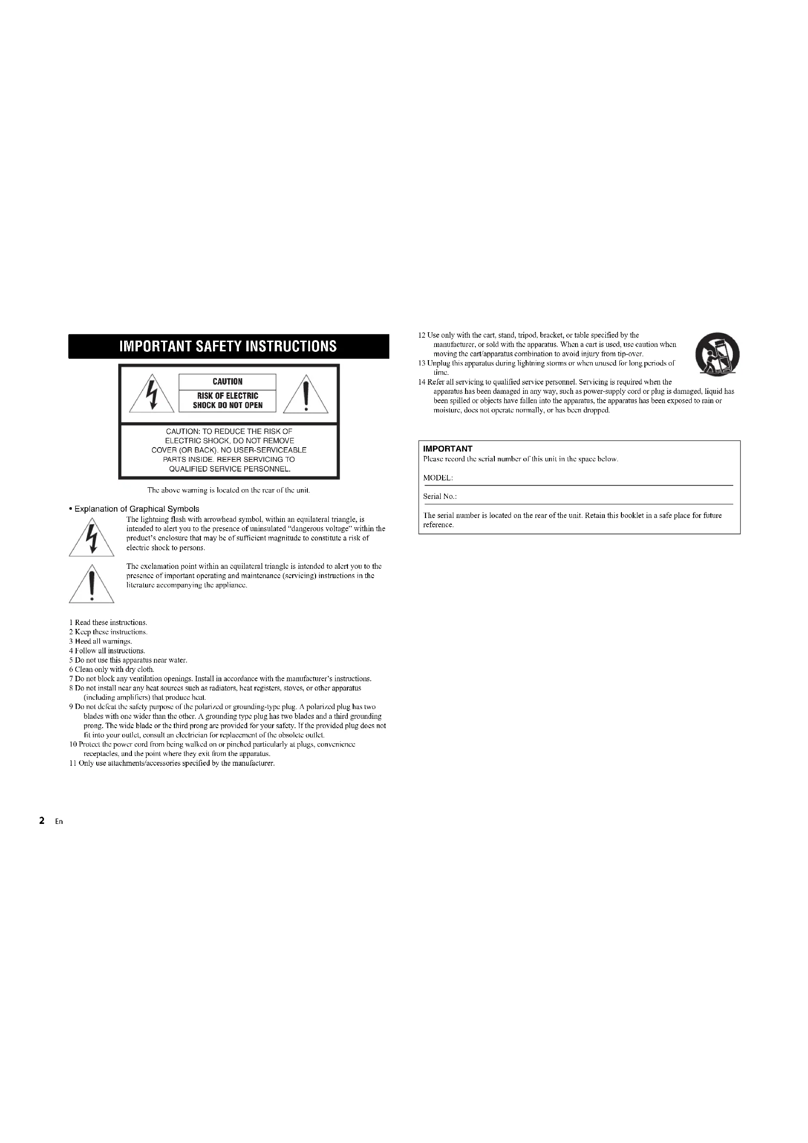 - Explanation of Graphical Symbols The lightning flash with arrowhead symbol, within an equilateral triangle, is intended to alert you to the presence of uninsulated “dangerous voltage” within the product’s enclosure that may be of sufficient magnitude to constitute a risk of electric shock to persons. The exclamation point within an equilateral triangle is intended to alert you to the presence of important operating and maintenance (servicing) instructions in the literature accompanying the appliance. 1 Read these instructions. 2 Keep these instructions. 3 Heed all warnings. 4 Follow all instructions. 5 Do not use this apparatus near water. 6 Clean only with dry cloth. 7 Do not block any ventilation openings. Install in accordance with the manufacturer’s instructions. 8 Do not install near any heat sources such as radiators, heat registers, stoves, or other apparatus (including amplifiers) that produce heat. 9 Do not defeat the safety purpose of the polarized or grounding-type plug. A polarized plug has two blades with one wider than the other. A grounding type plug has two blades and a third grounding prong. The wide blade or the third prong are provided for your safety. If the provided plug does not fit into your outlet, consult an electrician for replacement of the obsolete outlet. 10 Protect the power cord from being walked on or pinched particularly at plugs, convenience receptacles, and the point where they exit from the apparatus. 11 Only use attachments/accessories specified by the manufacturer. 12 Use only with the cart, stand, tripod, bracket, or table specified by the manufacturer, or sold with the apparatus. When a cart is used, use caution when moving the cart/apparatus combination to avoid injury from tip-over. 13 Unplug this apparatus during lightning storms or when unused for long periods of time. 14 Refer all servicing to qualified service personnel. Servicing is required when the apparatus has been damaged in any way, such as power-supply cord or plug is damaged, liquid has been spilled or objects have fallen into the apparatus, the apparatus has been exposed to rain or moisture, does not operate normally, or has been dropped.