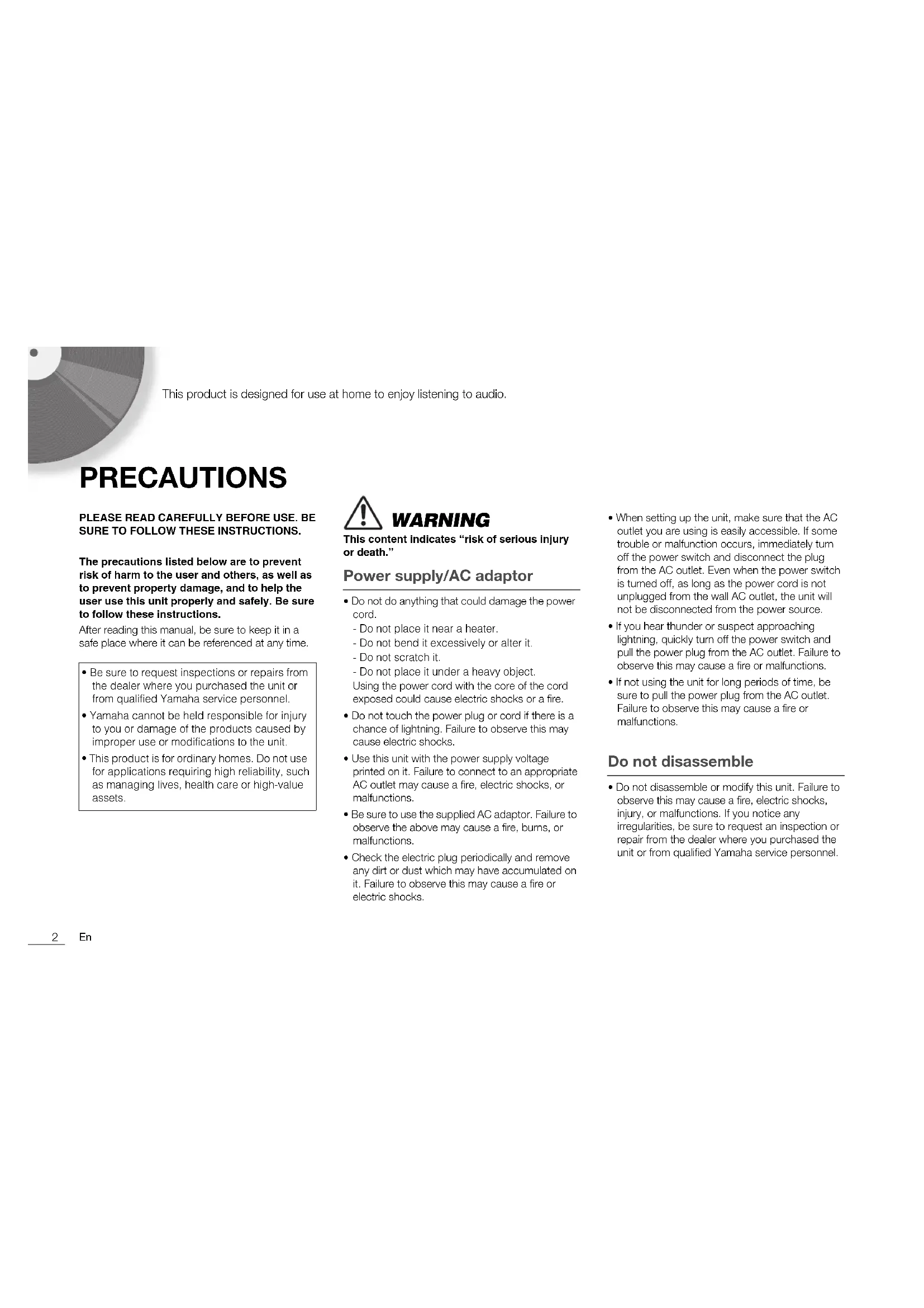 This product is designed for use at home to enjoy listening to audio. PRECAUTIONS