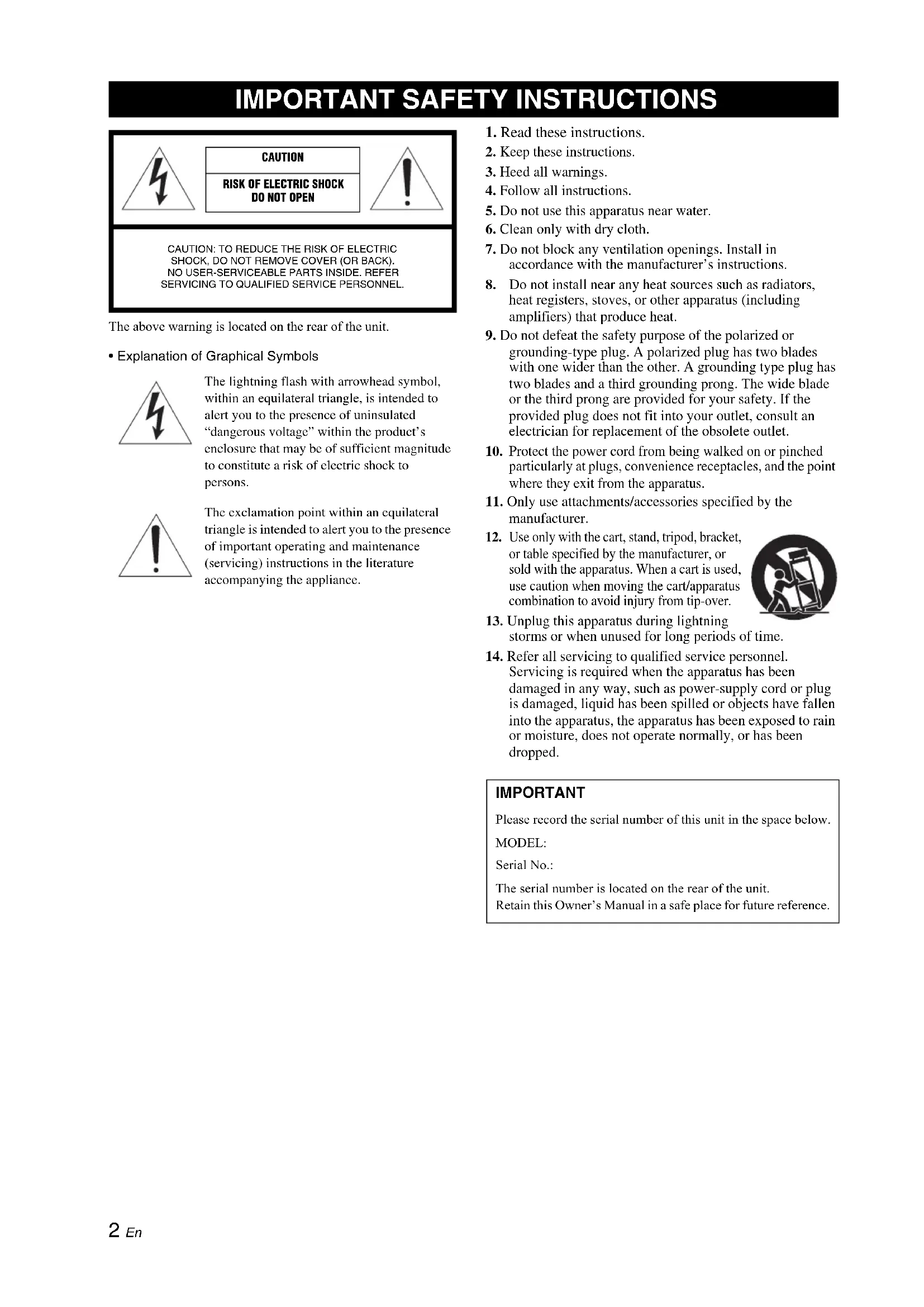- Explanation of Graphical Symbols The lightning flash with arrowhead symbol, within an equilateral triangle, is intended to alert you to the presence of uninsulated “dangerous voltage” within the product’s enclosure that may be of sufficient magnitude to constitute a risk of electric shock to persons. The exclamation point within an equilateral triangle is intended to alert you to the presence of important operating and maintenance (servicing) instructions in the literature accompanying the appliance. IMPORTANT Please record the serial number of this unit in the space below. MODEL: Serial No.: The serial number is located on the rear of the unit. Retain this Owner’s Manual in a safe place for future reference.3 En English