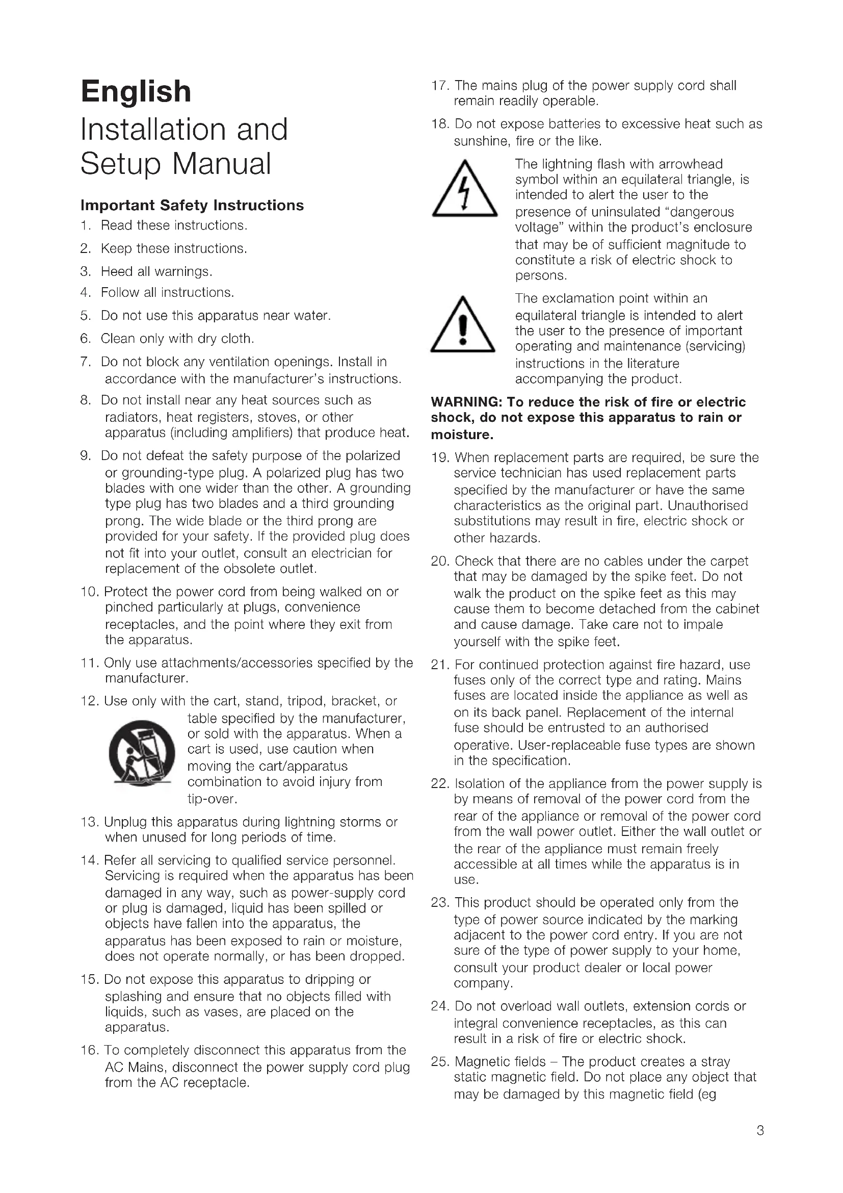 sunshine, fire or the like. The lightning flash with arrowhead symbol within an equilateral triangle, is intended to alert the user to the presence of uninsulated “dangerous voltage” within the product’s enclosure that may be of sufficient magnitude to constitute a risk of electric shock to persons. The exclamation point within an equilateral triangle is intended to alert the user to the presence of important operating and maintenance (servicing) instructions in the literature accompanying the product.