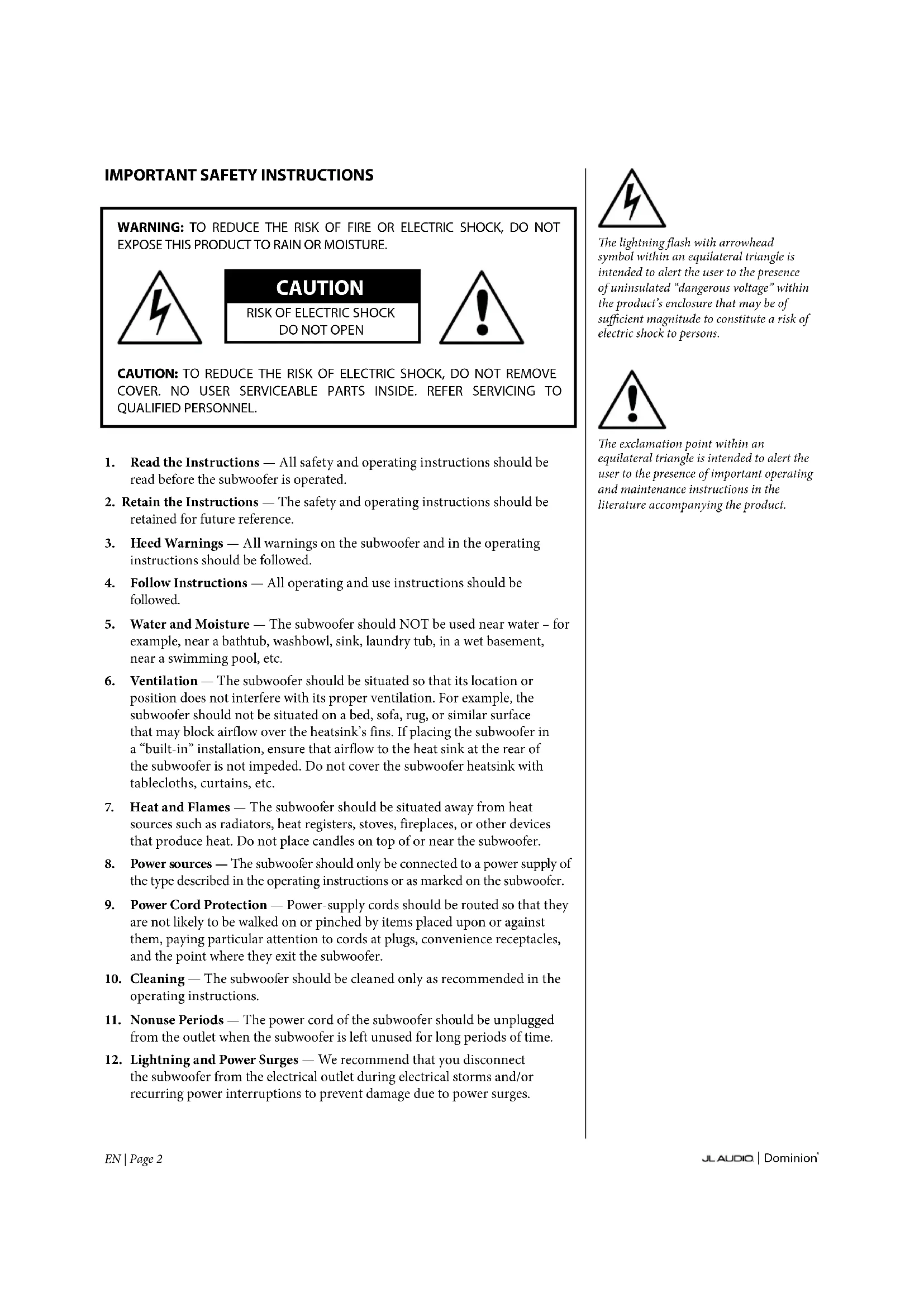 Congratulations on your purchase of a JL Audio Dominion* powered subwoofer system. This product has been critically engineered to deliver exceptional performance in your home theater or audio system for many years to come.
