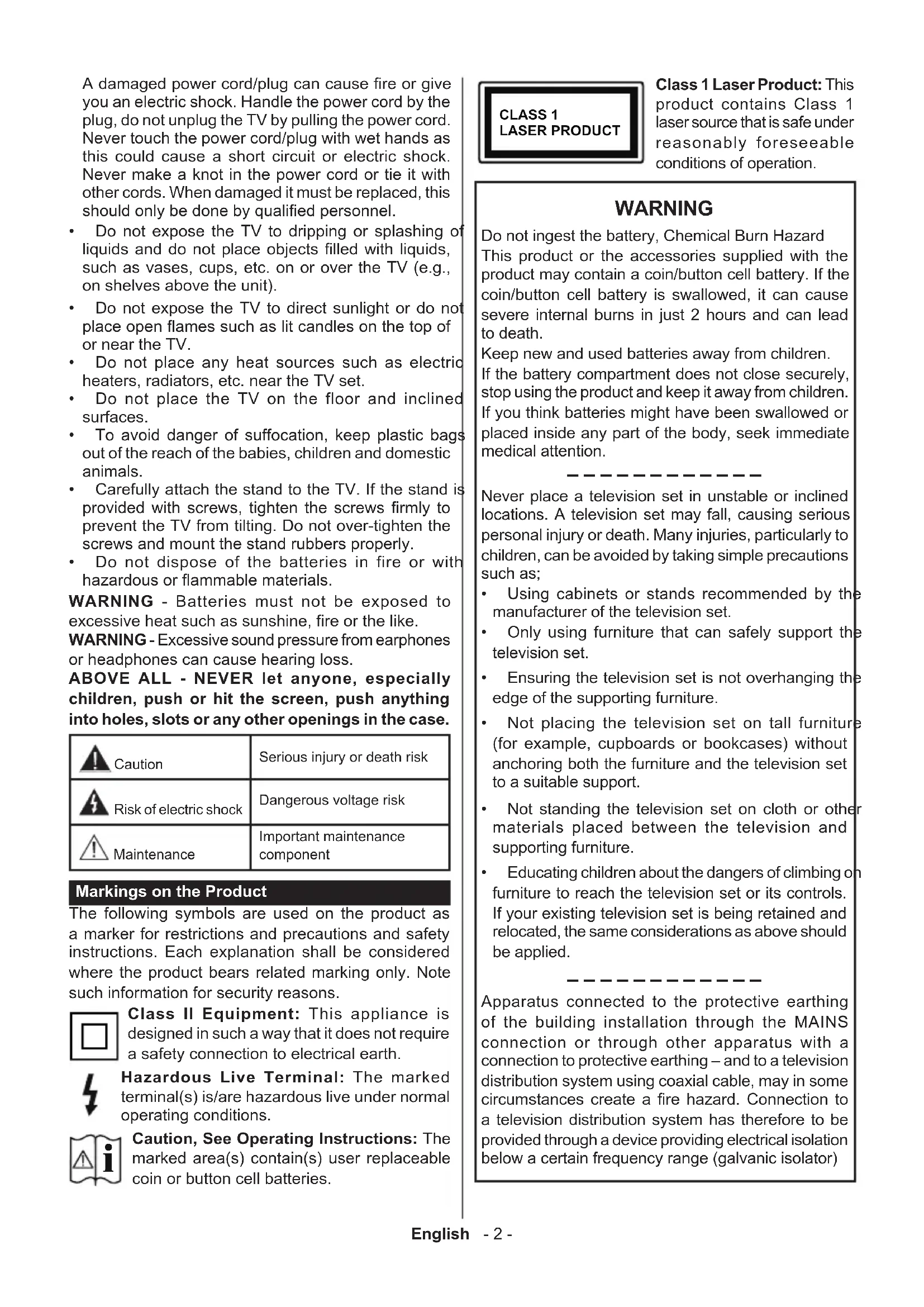 Caution, See Operating Instructions: The marked area(s) contain(s) user replaceable coin or button cell batteries. CLASS 1 LASER PRODUCT Class 1 Laser Product: This product contains Class 1 laser source that is safe under reasonably foreseeable conditions of operation. WARNING Do not ingest the battery, Chemical Burn Hazard This product or the accessories supplied with the product may contain a coin/button cell battery. If the coin/button cell battery is swallowed, it can cause severe internal burns in just 2 hours and can lead to death. Keep new and used batteries away from children. If the battery compartment does not close securely, stop using the product and keep it away from children. If you think batteries might have been swallowed or placed inside any part of the body, seek immediate medical attention. – – – – – – – – – – – – Never place a television set in unstable or inclined locations. A television set may fall, causing serious personal injury or death. Many injuries, particularly to children, can be avoided by taking simple precautions such as;