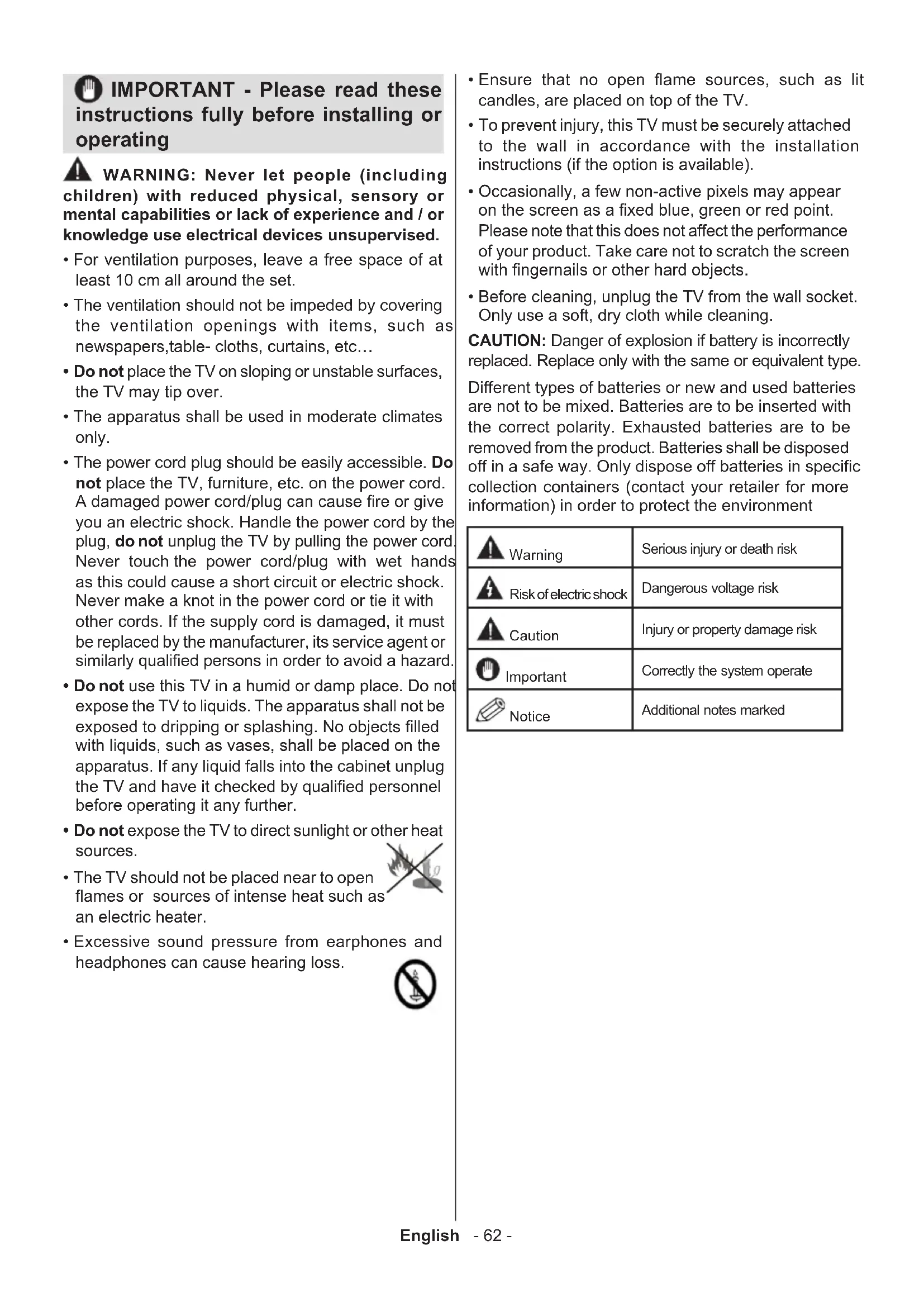 - Before cleaning, unplug the TV from the wall socket. Only use a soft, dry cloth while cleaning. CAUTION: Danger of explosion if battery is incorrectly replaced. Replace only with the same or equivalent type. Different types of batteries or new and used batteries are not to be mixed. Batteries are to be inserted with the correct polarity. Exhausted batteries are to be removed from the product. Batteries shall be disposed off in a safe way. Only dispose off batteries in specic collection containers (contact your retailer for more information) in order to protect the environment Warning Serious injury or death risk Risk of electric shock Dangerous voltage risk Caution Injury or property damage risk Important Correctly the system operate Notice Additional notes marked IMPORTANT - Please read these instructions fully before installing or operating
