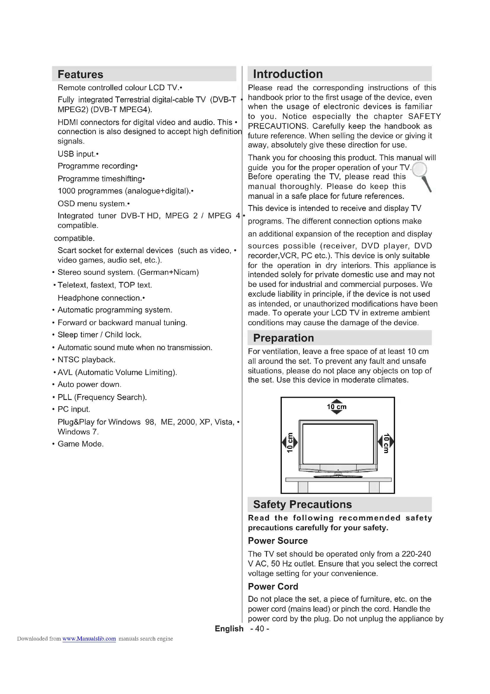 - Specications Downloaded from www.Manualslib.com manuals search engineEnglish - 40 - Features Remote controlled colour LCD TV.• Fully integrated Terrestrial digital-cable TV (DVB-T • MPEG2) (DVB-T MPEG4). HDMI connectors for digital video and audio. This • connection is also designed to accept high denition signals. USB input.• Programme recording• Programme timeshifting• 1000 programmes (analogue+digital).• OSD menu system.• Integrated tuner DVB-T HD, MPEG 2 / MPEG 4 • compatible. compatible. Scart socket for external devices (such as video, • video games, audio set, etc.). Stereo sound system. (German+Nicam)• Teletext, fastext, TOP text.• Headphone connection.• Automatic programming system.• Forward or backward manual tuning.• Sleep timer / Child lock.• Automatic sound mute when no transmission.• NTSC playback. • AVL (Automatic Volume Limiting).• Auto power down.• PLL (Frequency Search).• PC input. • Plug&Play for Windows 98, ME, 2000, XP, Vista, • Windows 7. Game Mode. • Introduction Please read the corresponding instructions of this handbook prior to the rst usage of the device, even when the usage of electronic devices is familiar to you. Notice especially the chapter SAFETY PRECAUTIONS. Carefully keep the handbook as future reference. When selling the device or giving it away, absolutely give these direction for use. Thank you for choosing this product. This manual will guide you for the proper operation of your TV. Before operating the TV, please read this manual thoroughly. Please do keep this manual in a safe place for future references. This device is intended to receive and display TV programs. The different connection options make an additional expansion of the reception and display sources possible (receiver, DVD player, DVD recorder,VCR, PC etc.). This device is only suitable for the operation in dry interiors. This appliance is intended solely for private domestic use and may not be used for industrial and commercial purposes. We exclude liability in principle, if the device is not used as intended, or unauthorized modications have been made. To operate your LCD TV in extreme ambient conditions may cause the damage of the device. Preparation For ventilation, leave a free space of at least 10 cm all around the set. To prevent any fault and unsafe situations, please do not place any objects on top of the set. Use this device in moderate climates. 10 cm10 cm10 cm Safety Precautions Read the following recommended safety precautions carefully for your safety. Power Source The TV set should be operated only from a 220-240 V AC, 50 Hz outlet. Ensure that you select the correct voltage setting for your convenience. Power Cord Do not place the set, a piece of furniture, etc. on the power cord (mains lead) or pinch the cord. Handle the power cord by the plug. Do not unplug the appliance by Downloaded from www.Manualslib.com manuals search engineEnglish - 41 - pulling from the power cord and never touch the power cord with wet hands as this could cause a short circuit or electric shock. Never make a knot in the cord or tie it with other cords. The power cords should be placed in such a way that they are not likely to be stepped on. A damaged power cord can cause re or give you an electric shock. When it is damaged and needs to be replaced, it should be done by qualied personnel. Moisture and Water Do not use this device in a humid and damp place (avoid the bathroom, the sink in the kitchen, and near the washing machine). Do not expose this device to rain or water, as this may be dangerous and do not place objects filled with liquids, such as ower vases, on top. Avoid from dripping or splashing. If any solid object or liquid falls into the cabinet, unplug the TV and have it checked by qualied personnel before operating it any further. Cleaning Before cleaning, unplug the TV set from the wall outlet. Do not use liquid or aerosol cleaners. Use soft and dry cloth. Ventilation The slots and openings on the TV set are intended for ventilation and to ensure reliable operation. To prevent overheating, these openings must not be blocked or covered in anyway. Heat and Flames The set should not be placed near to open ames and sources of intense heat such as an electric heater. Ensure that no open ame sources, such as lighted candles, are placed on top of the TV. Batteries should not be exposed to excessive heat such as sunshine, re or the like. Lightning In case of storm and lightning or when going on holiday, disconnect the power cord from the wall outlet. Replacement Parts When replacement parts are required, make sure that the service technician has used replacement parts, which are specied by the manufacturer or have the same specications as the original one. Unauthorized substitutions may result in re, electrical shock or other hazards. Servicing Please refer all servicing to qualied personnel. Do not remove the cover yourself as this may result in an electric shock. Waste Disposal Instructions for waste disposal:• Packaging and packaging aids are recyclable and should principally be recycled. Packaging materials, such as foil bag, must be kept away from children. Batteries, including those which are heavy metal-free, should not be disposed of with household waste. Please dispose of used battery in an environment friendly manner. Find out about the legal regulations which apply in your area. Don’t try to recharge batteries. Danger of explosion. • Replace batteries only with the same or equivalent type. This symbol on the product or on its packaging means that your electrical and electronic device should be disposed at the end of its service life separately from your household wastes. There are separate collection systems for recycling in EU. For more information, please contact the local authority or the dealer where you purchased the product. Disconnecting the Device The mains plug is used to disconnect TV set from the mains and there