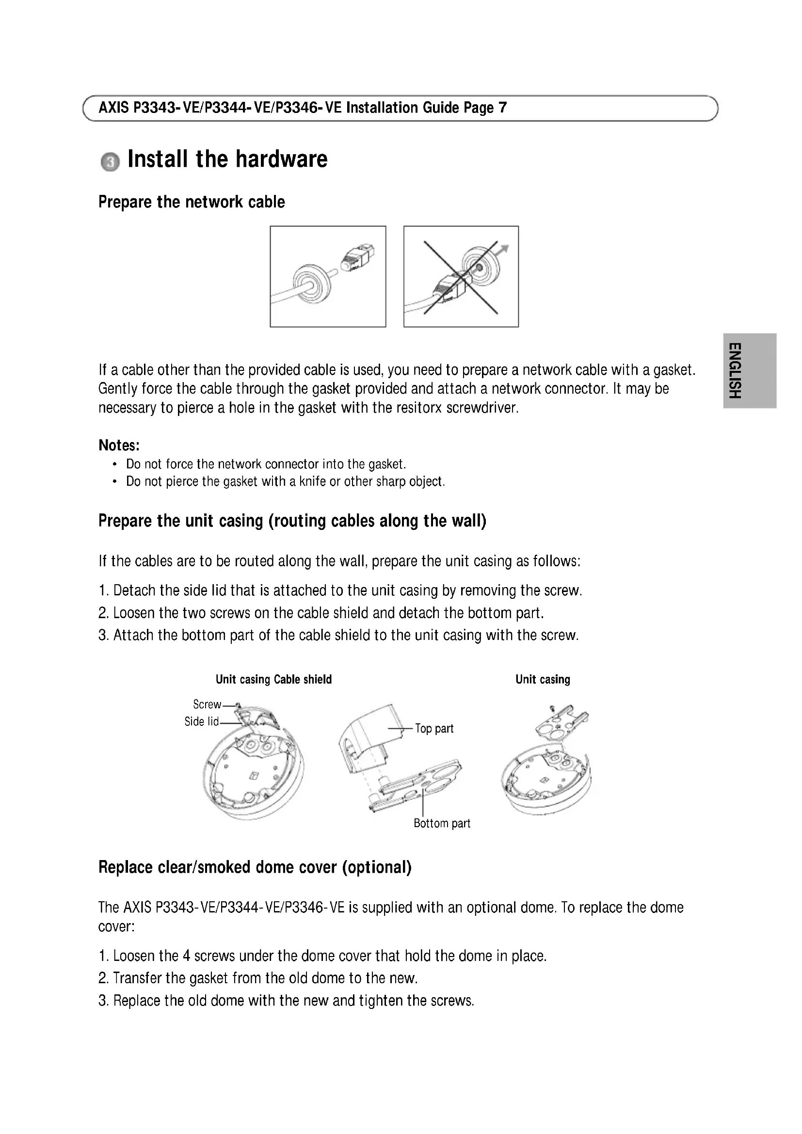 Mounting bracket Dome covers Clear transparent cover Smoked transparent cover Cable shield Weather shield Labels 2 adhesive serial no. labels Mounting kit Resitorx screw driver, drill template, 5-meter network cable with gasket 4 screws and plugs, 2 long screws, 2 M4x8 screws 1 gasket, terminal block connector CD AXIS Network Video Product CD including product documentation, installation tools and other software Printed Materials Installation Guide (this document) Axis Warranty Document AVHS Authentication key Optional accessories See www.axis.com for information on available accessories Important! This product must be used in compliance with local laws and regulations.Page 6 AXIS P3343-VE/P3344-VE/P3346-VE Installation Guide Hardware overview Caution! The heater in the camera unit may be hot. Dimension (HxW) AXIS P3343-VE/AXIS P3344-VE = 110 x 179 mm (4.3 x 7.105") AXIS P3346-VE = 117 x 179 mm (4.59” x 7.05”) Weight AXIS P3343-VE/AXIS P3344-VE = 1.4 kg (3.09 lb.) AXIS P3346-VE = 1.6 kg (3.5 lb) Fan output connectorUnit casingCamera unitDome coverHoles for cablesrouted through the wallSide holes withNetwork connectorLED indicatorsControl button Camera unit Audio in(PoE)Audio outSD memory card slotSerial no.HeaterWeather shieldSpringrouted along the wallfor cablesgasketsI/O connectorMounting bracketAXIS P3343-VE/P3344-VE/P3346-VE Installation Guide Page 7 ENGLISH Install the hardware Prepare the network cable If a cable other than the provided cable is used, you need to prepare a network cable with a gasket. Gently force the cable through the gasket provided and attach a network connector. It may be necessary to pierce a hole in the gasket with the resitorx screwdriver. Notes: