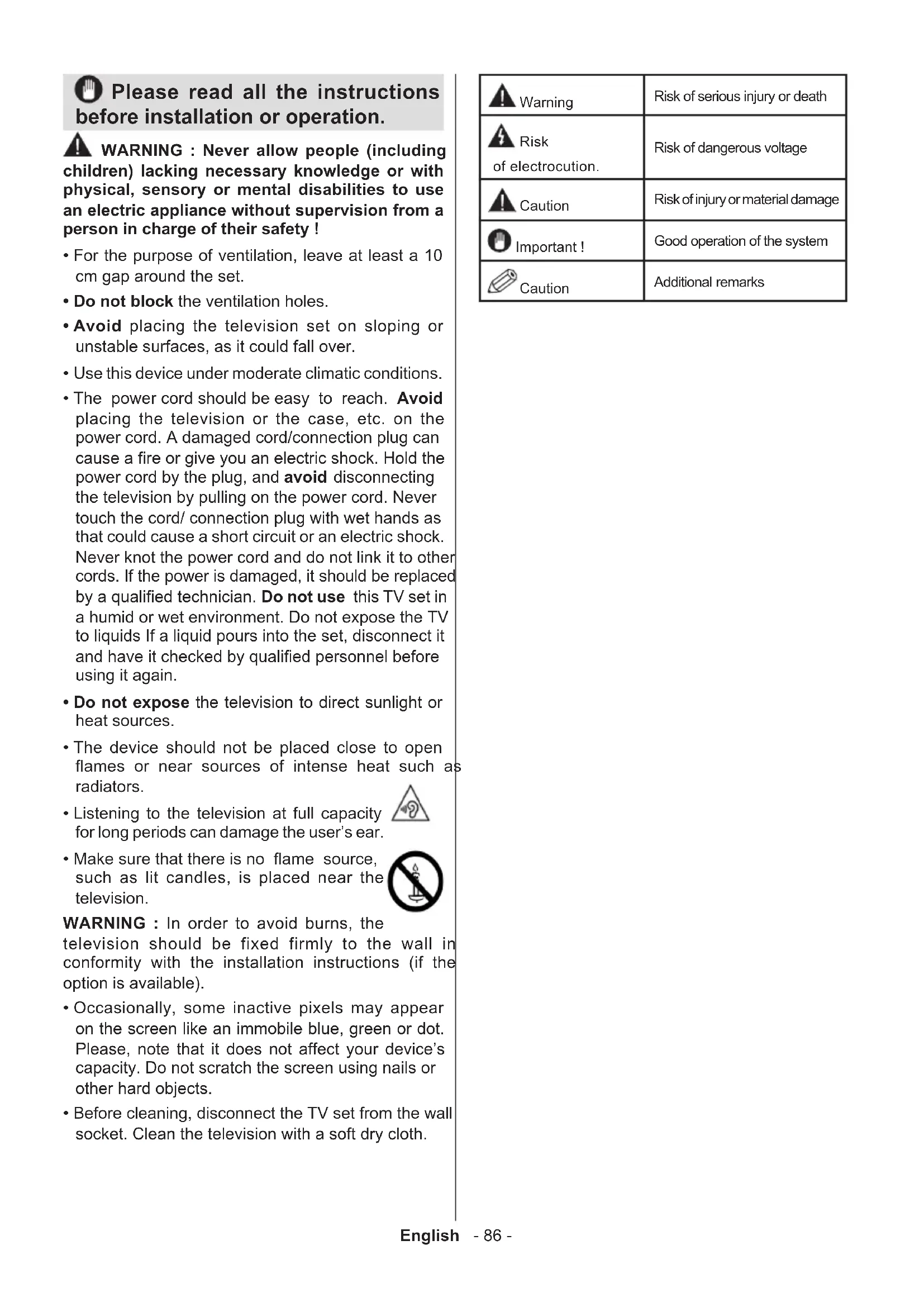 - Make sure that there is no ame source, such as lit candles, is placed near the television.