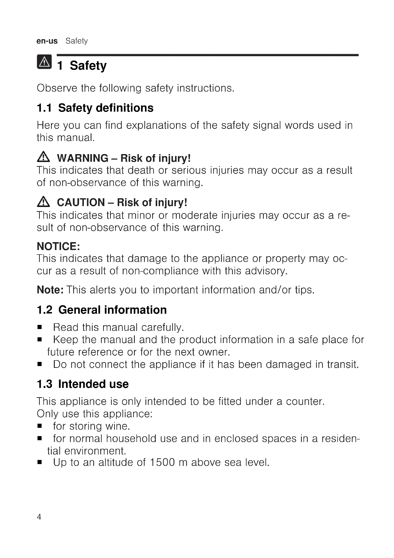 1 Safety Observe the following safety instructions. 1.1 Safety definitions Here you can find explanations of the safety signal words used in this manual. WARNING‒Risk of injury! This indicates that death or serious injuries may occur as a result of non-observance of this warning. CAUTION‒Risk of injury! This indicates that minor or moderate injuries may occur as a re- sult of non-observance of this warning. NOTICE: This indicates that damage to the appliance or property may oc- cur as a result of non-compliance with this advisory. Note:This alerts you to important information and/or tips. 1.2 General information ¡ Read this manual carefully. ¡ Keep the manual and the product information in a safe place for future reference or for the next owner. ¡ Do not connect the appliance if it has been damaged in transit. 1.3 Intended use This appliance is only intended to be fitted under a counter. Only use this appliance: ¡ for storing wine. ¡ for normal household use and in enclosed spaces in a residen- tial environment. ¡ Up to an altitude of 1500m above sea level.Safety en-us